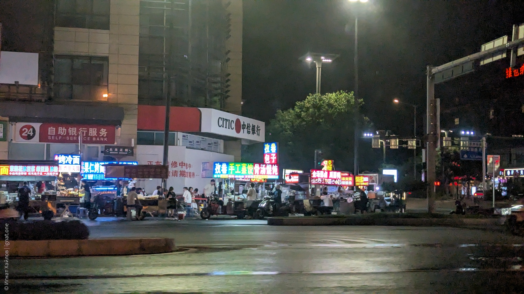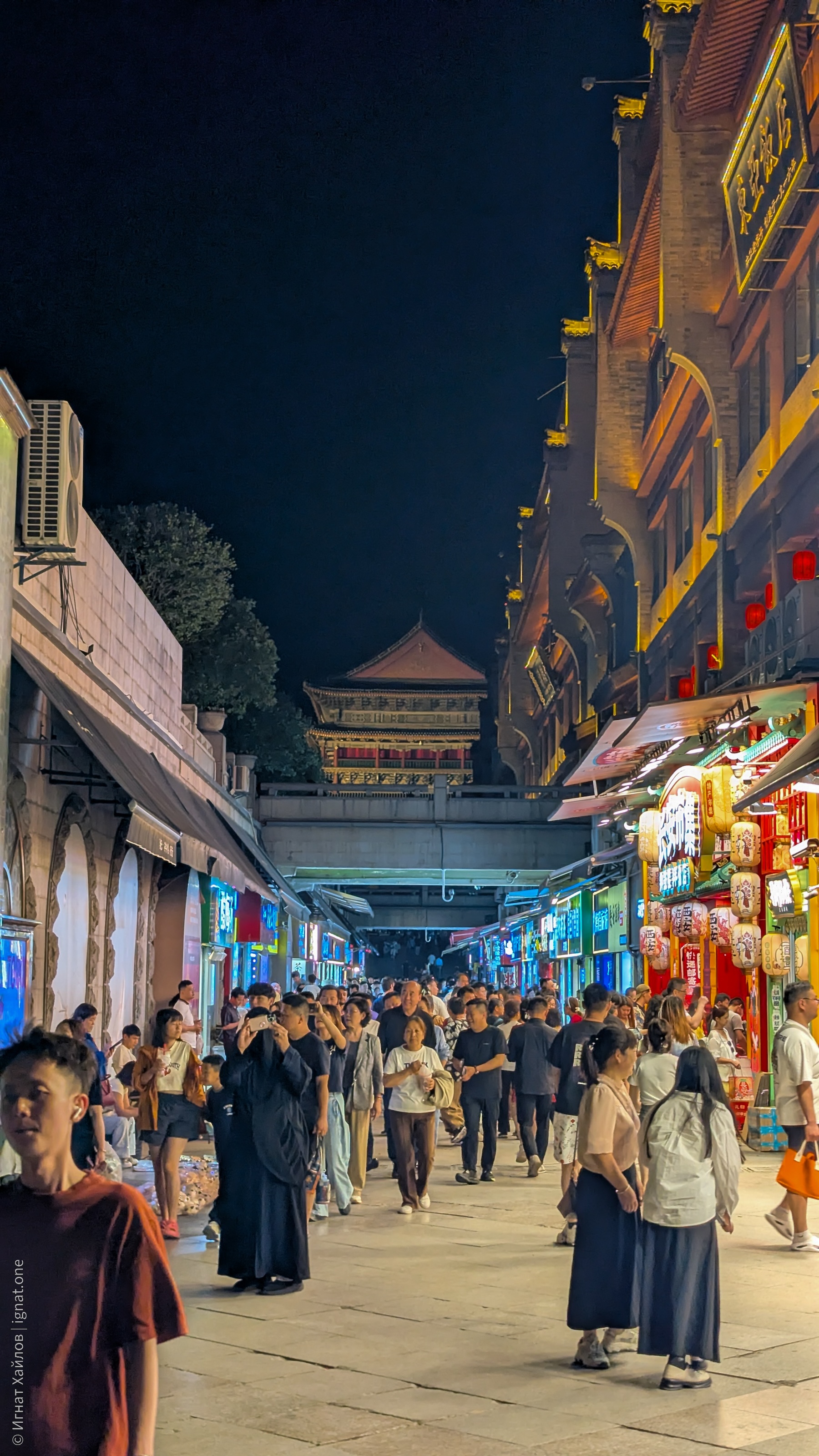 Сфотографировались, и пошли на другую сторону площади. Где-то в этот момент я стал получать удовольствие от Сианя и от Китая в целом. Если Пекин мне казался очень зарегулированным, то вот вечерний Сиань прямо раскрылся: мы оказались в каком-то калейдоскопе: китаянки в традиционных нарядах, уличные фотографы, стримеры, лавки с едой, просто толпы гуляк — все оказались в одном месте. Город просто задышал. После Пекина это был как глоток свежего воздуха.