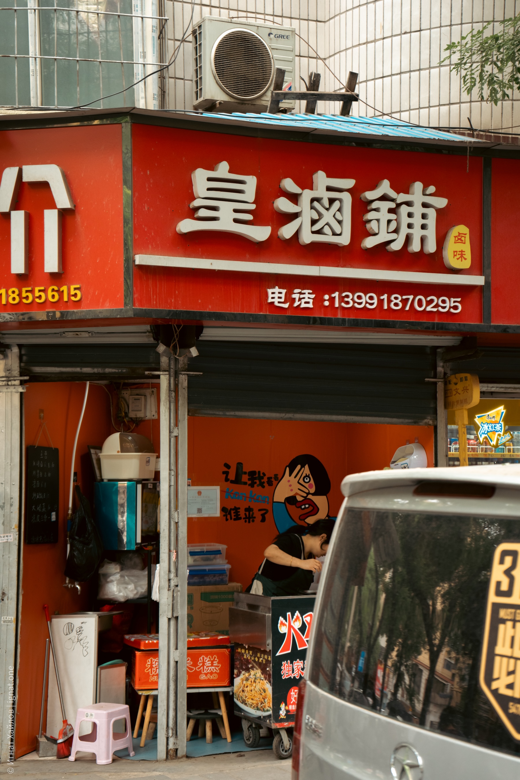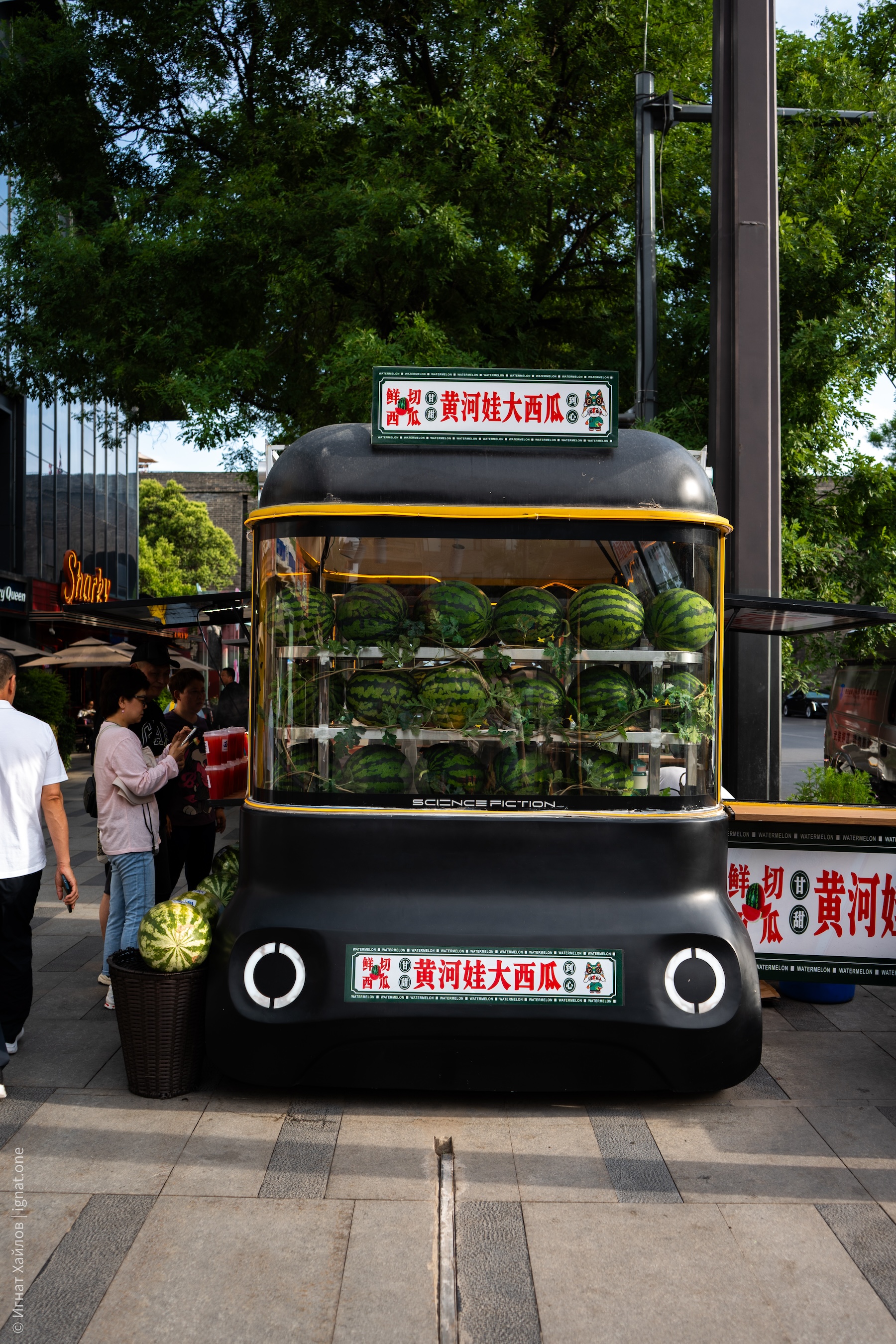 Заметили вот такую мобильную лавку с арбузами. К слову, почти во всех городах, где мы были, я регулярно натыкался на лавки с арбузными фрешами. Как потом прочитал — оказывается, Китай производит более 60% мирового урожая арбузов.