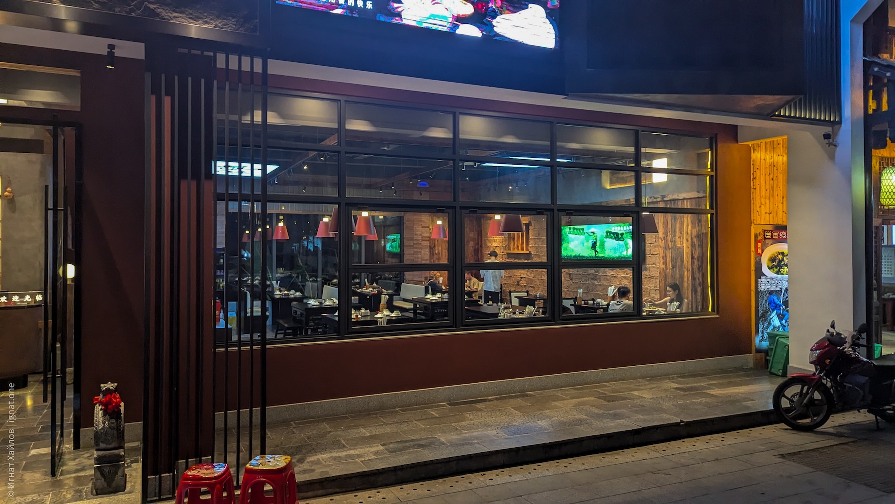 Вернувшись в город, начали искать место для ужина. Помня про вчерашнюю курицу по-сычуански, решили посмотреть место с более традиционной едой. Через дорогу от гостиницы нашли отличный ресторан