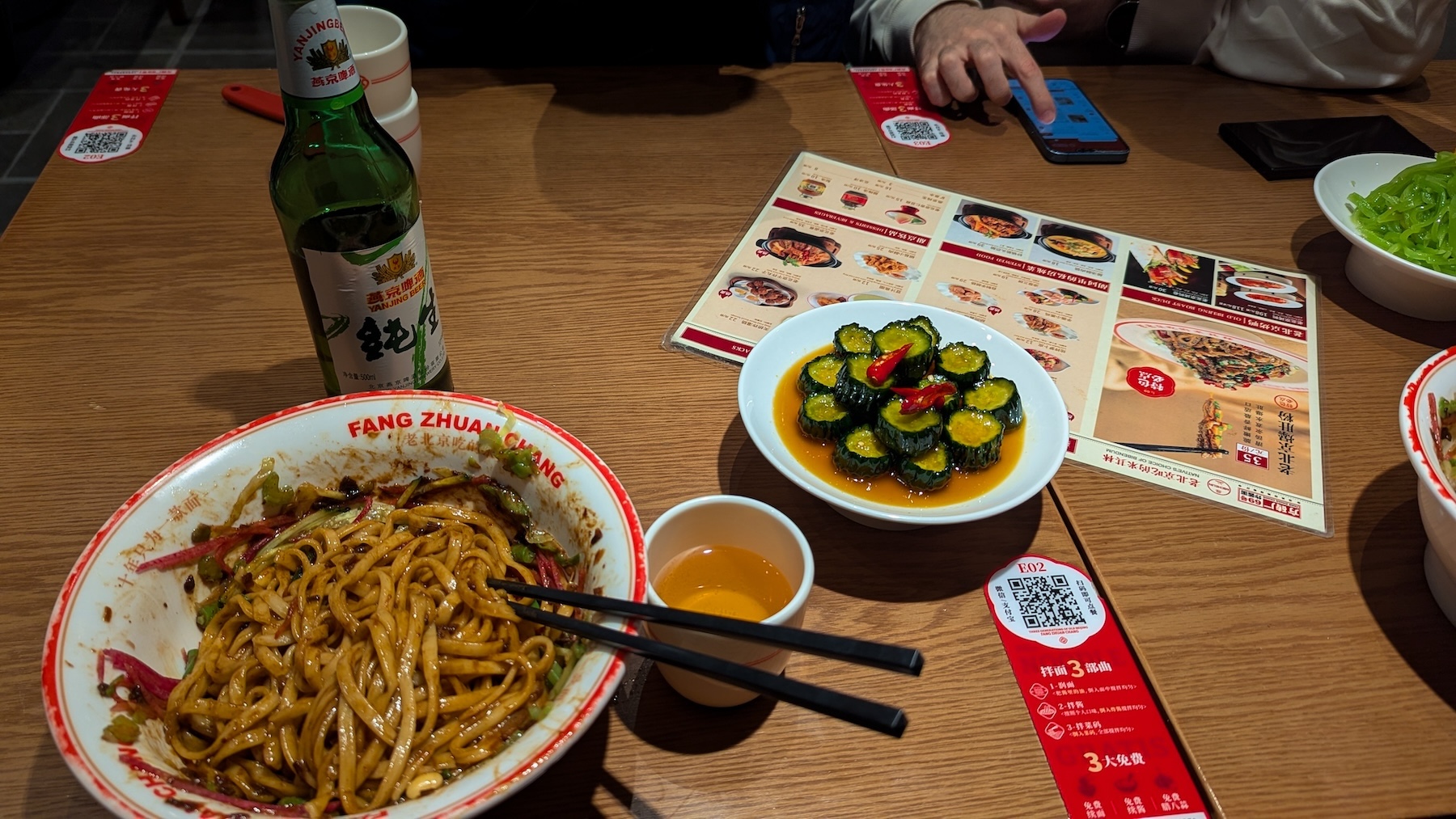 Еда оказалась обычной. Из прикольного — для того, чтобы сделать заказ, нужно было отсканировать QR-код на столе, и тогда в приложении Alipay открывается меню, что-то подобное мы встречали в Японии.