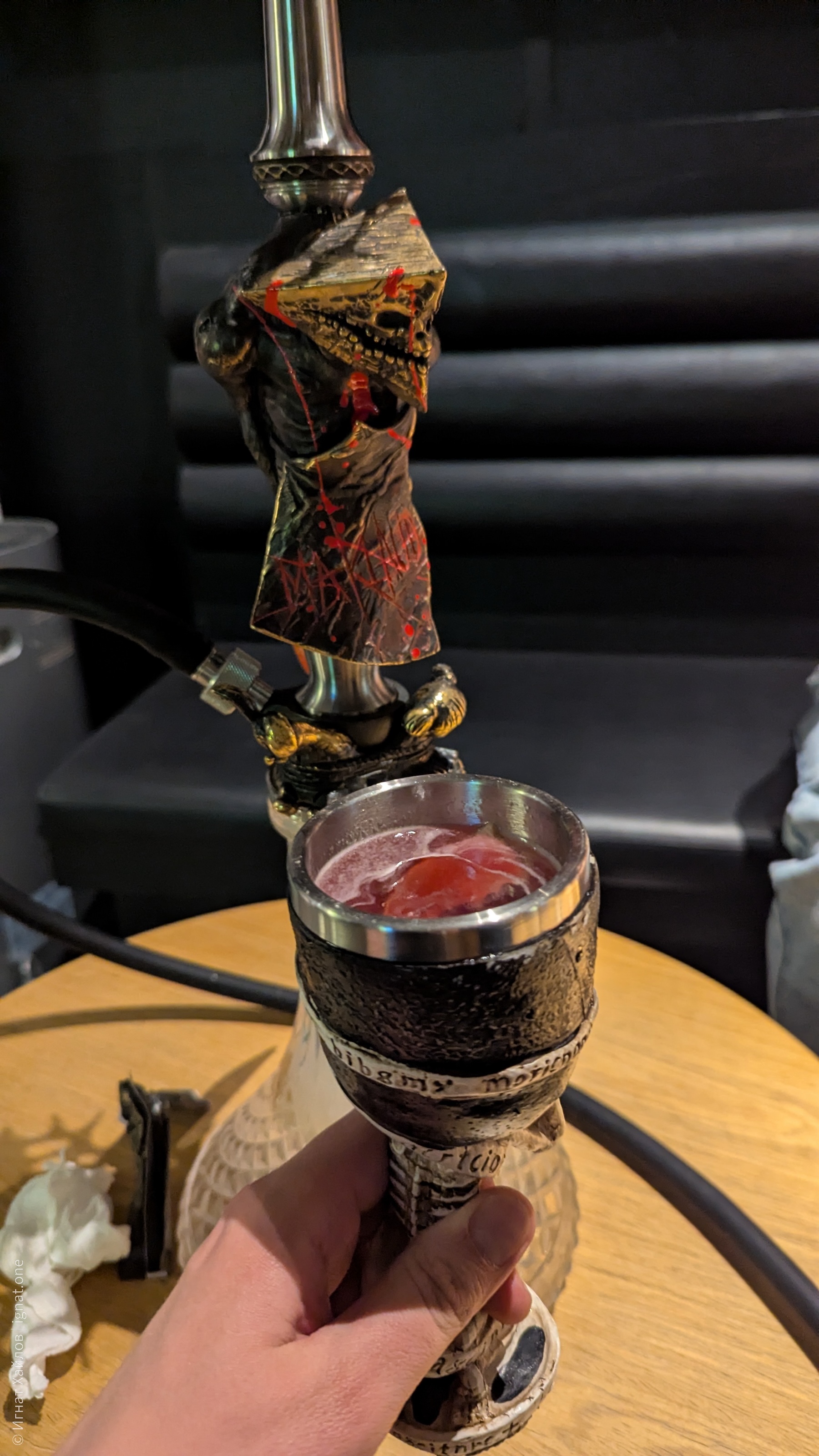 После ужина вернулись обратно в гостиницу, и уже собравшись ложиться спать, в лобби обнаружили кальянную. Вообще ничего особенного от нее не ожидали, но кальяны оказались обалденными, с какими-то совершенно безумными конструкциями, которые украшали сам кальян.