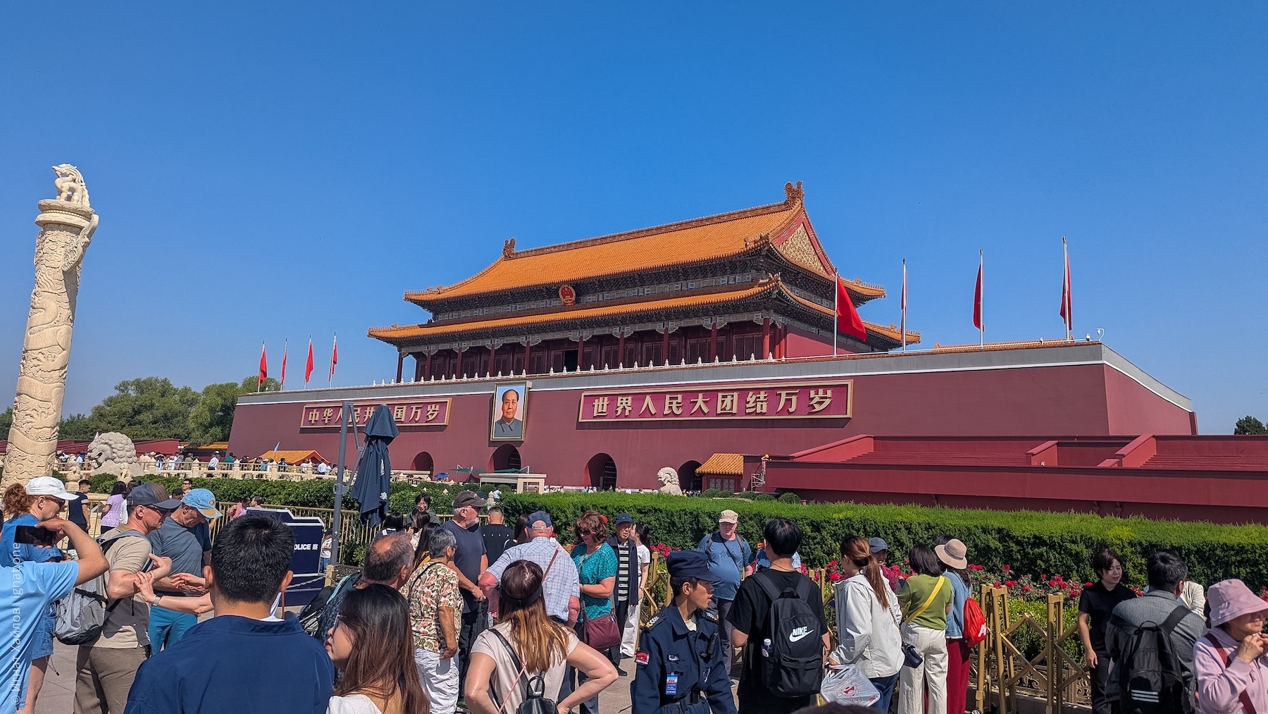 Первое, что мы видим, когда проходим КПП — это сами ворота Тяньаньмэнь, южный вход в Запретный город. Сами ворота украшает портрет Мао Цзэдуна, напоминающий о создании КНР.