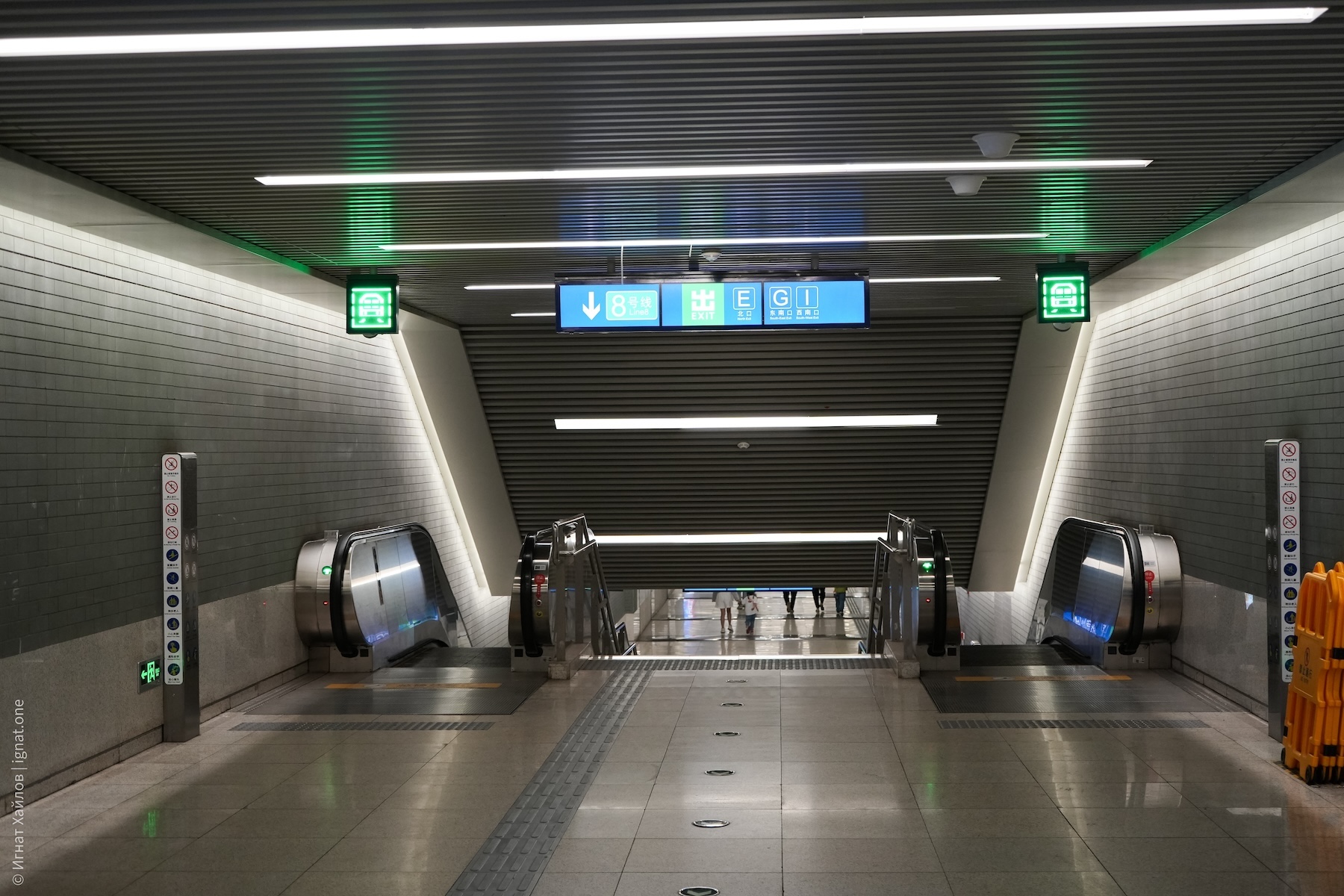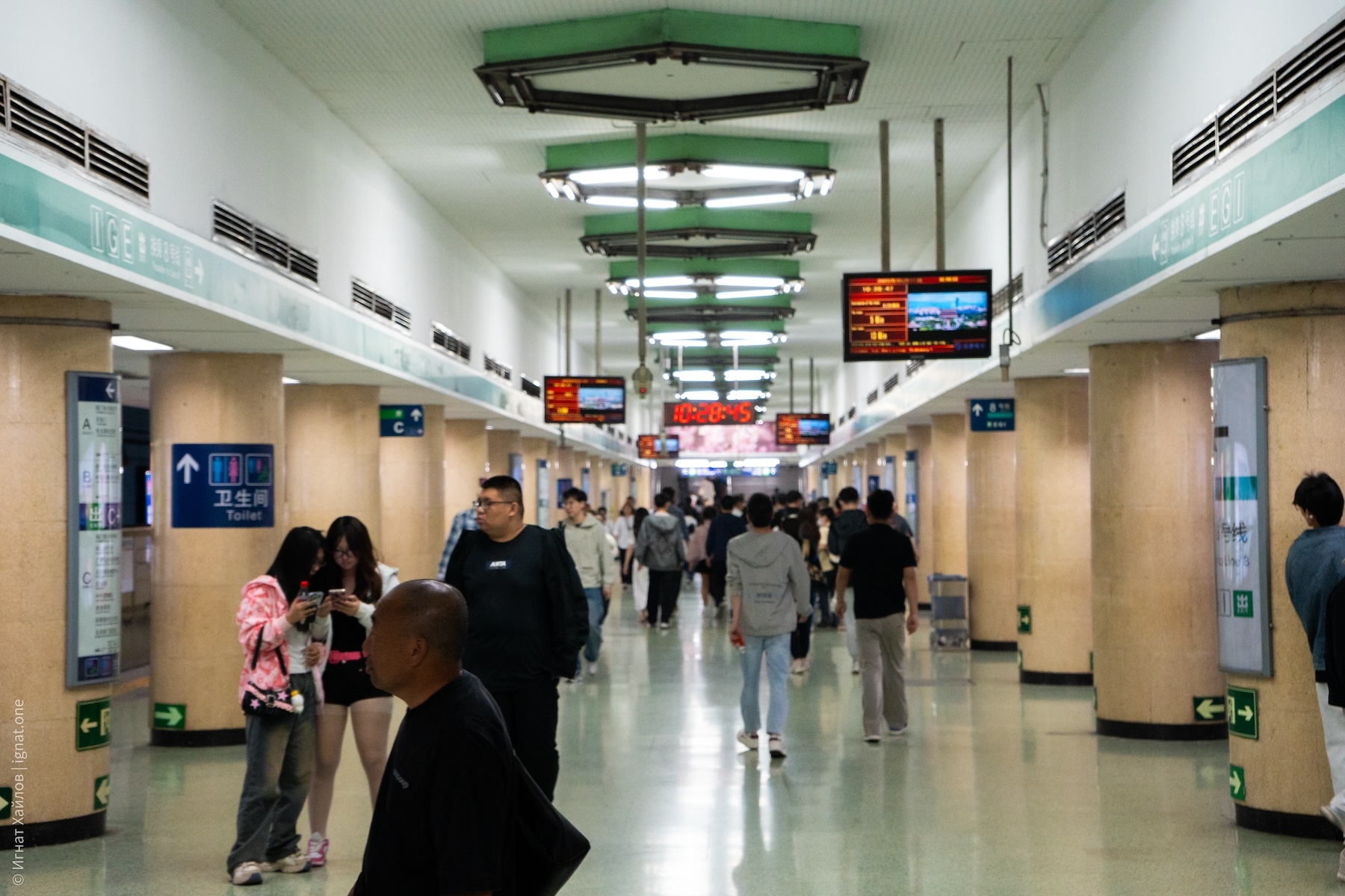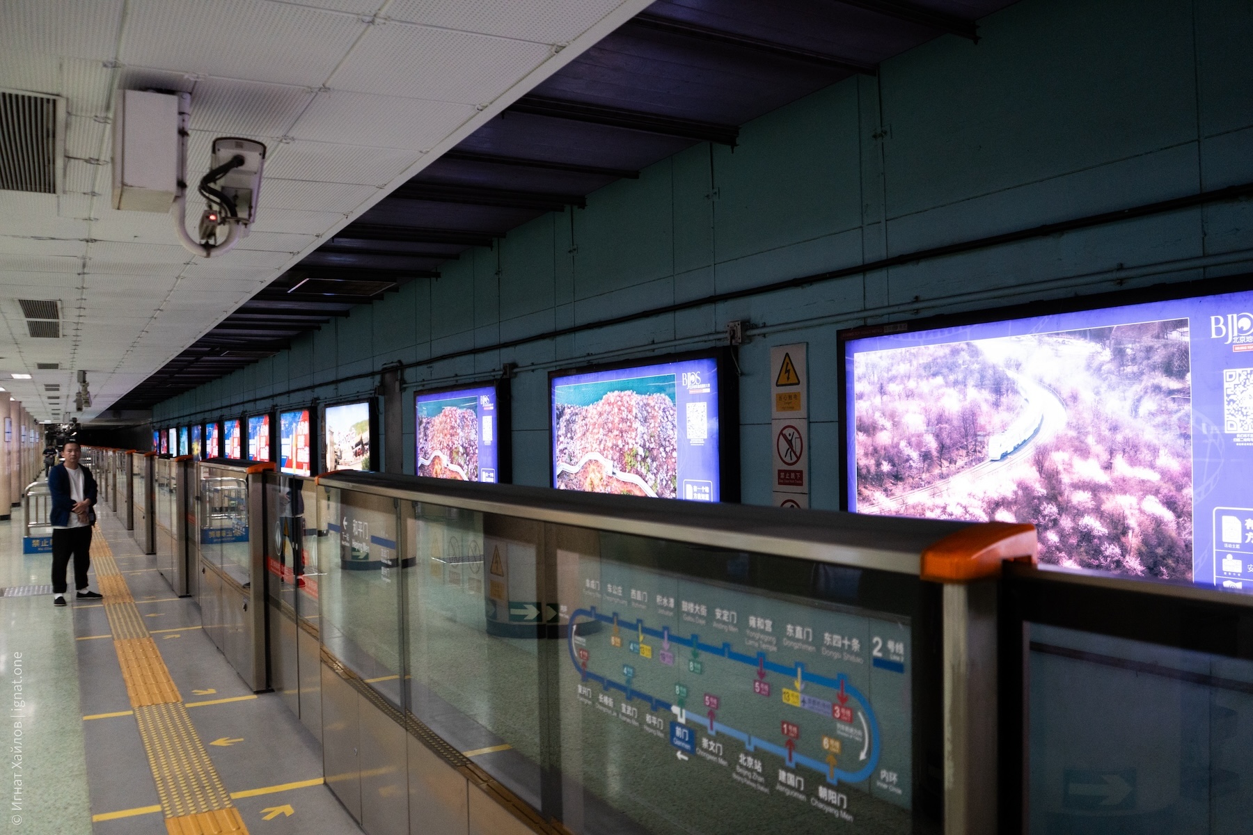 Спускаемся в метро. Честно говоря, я ждал, что оно будет как московское, и каждая станция будет оформлена в своем уникальном стиле, но оказалось, что пекинская подземка довольно утилитарная. Кстати, билеты приобретались через Alipay — внутри приложения есть отдельный раздел с общественным транспортом, и нужно было два раза отсканировать QR-код: на входе и на выходе. Стоимость поездки рассчитывается по количеству станций.