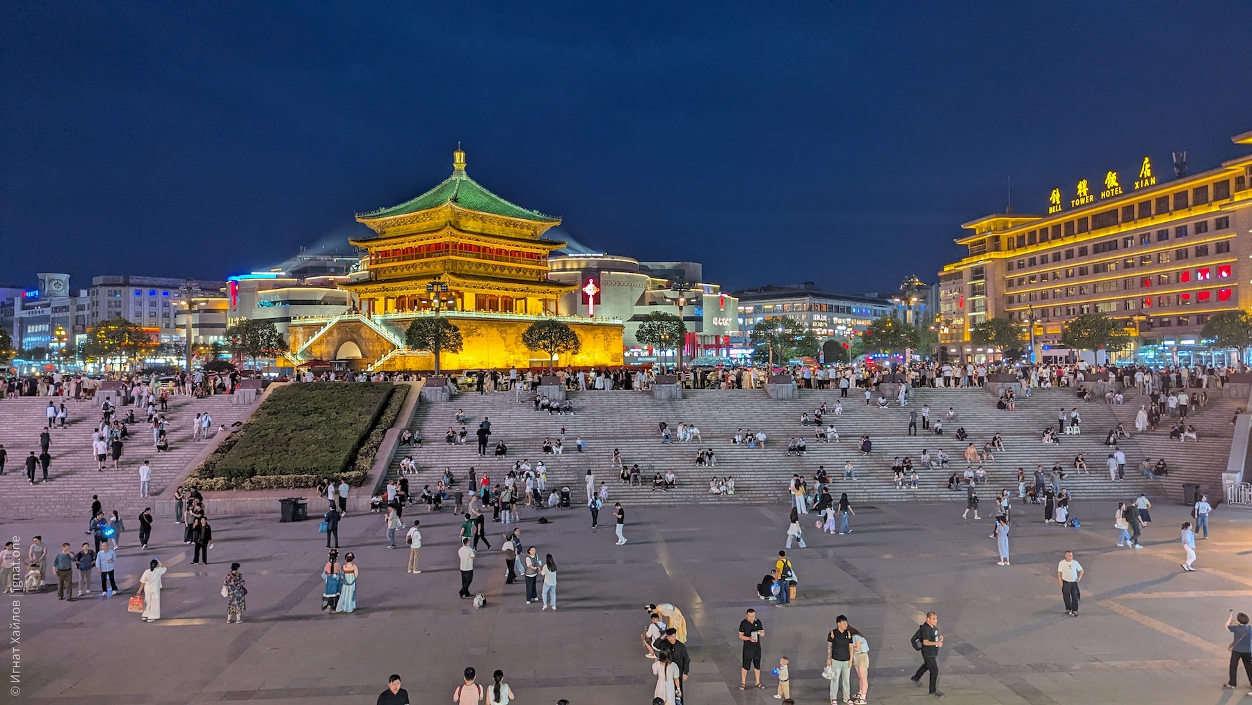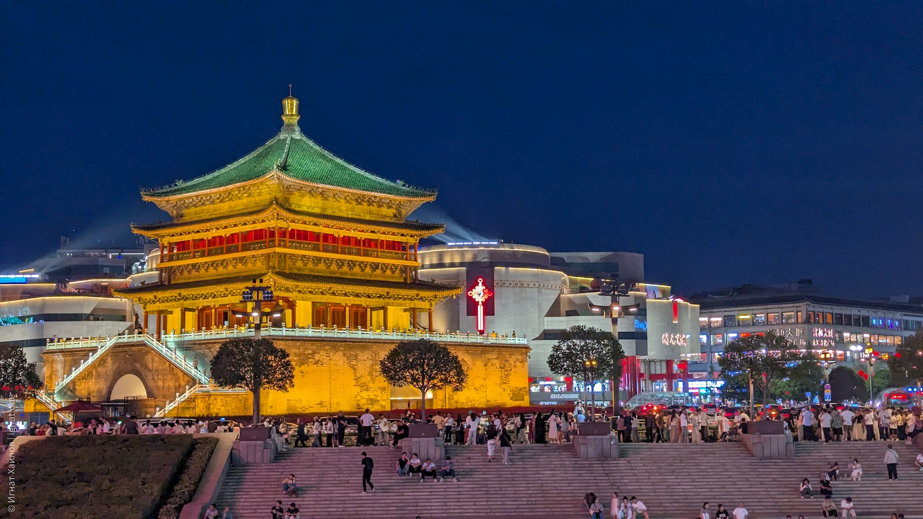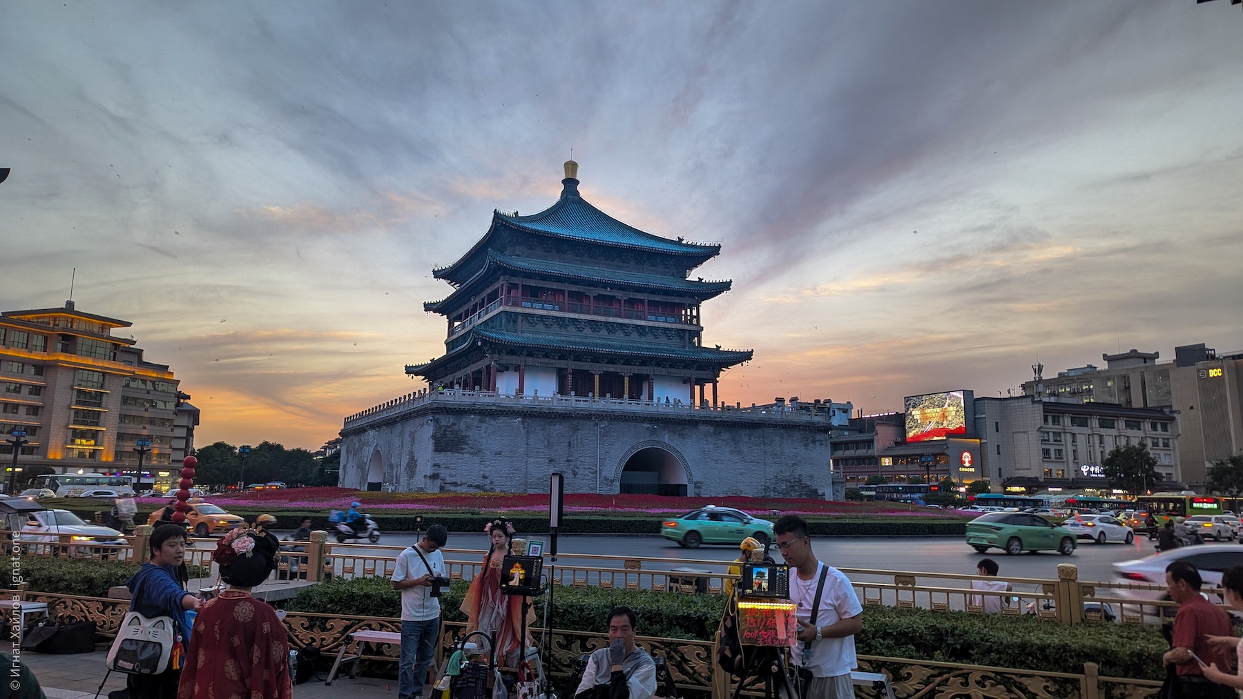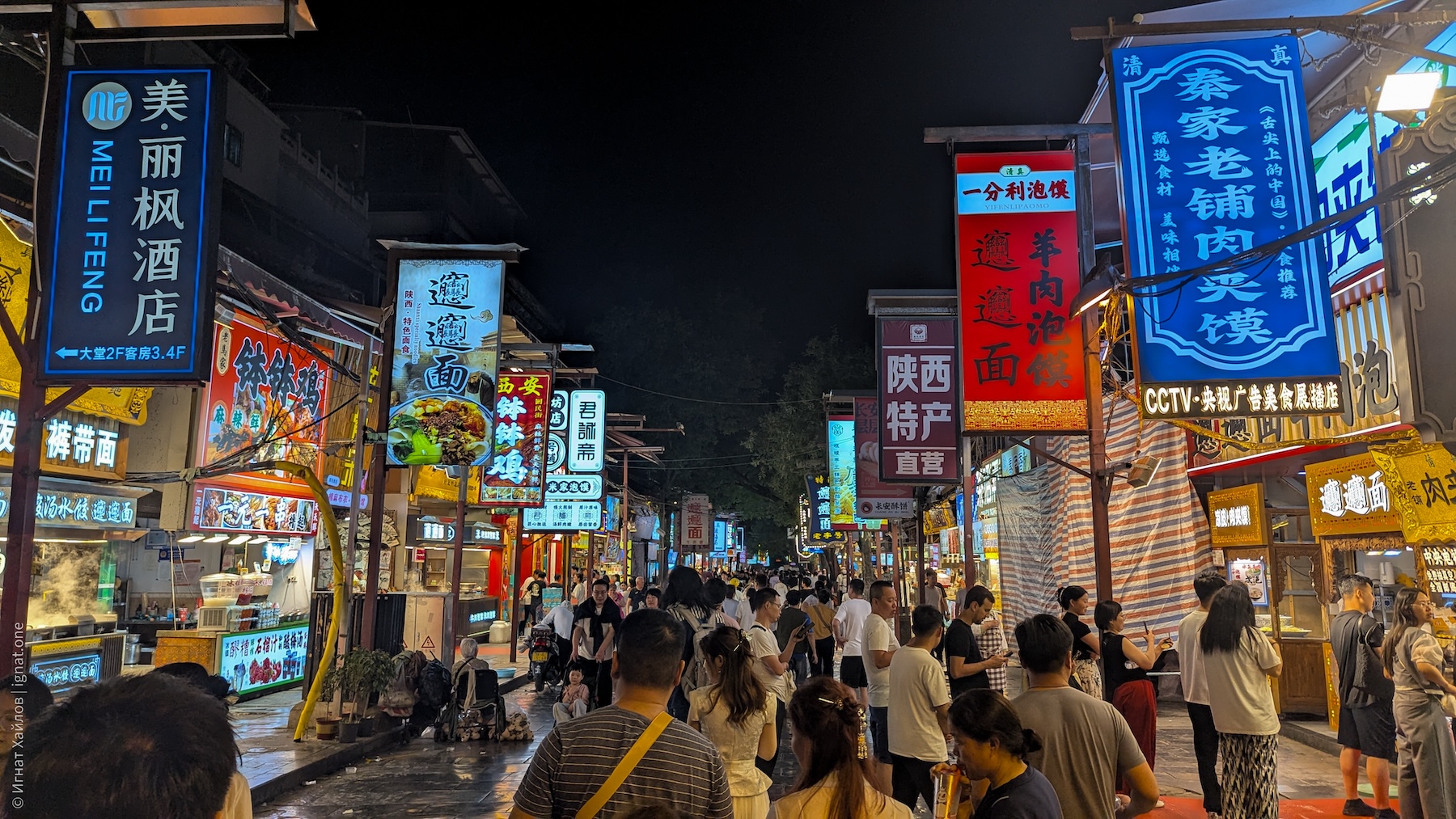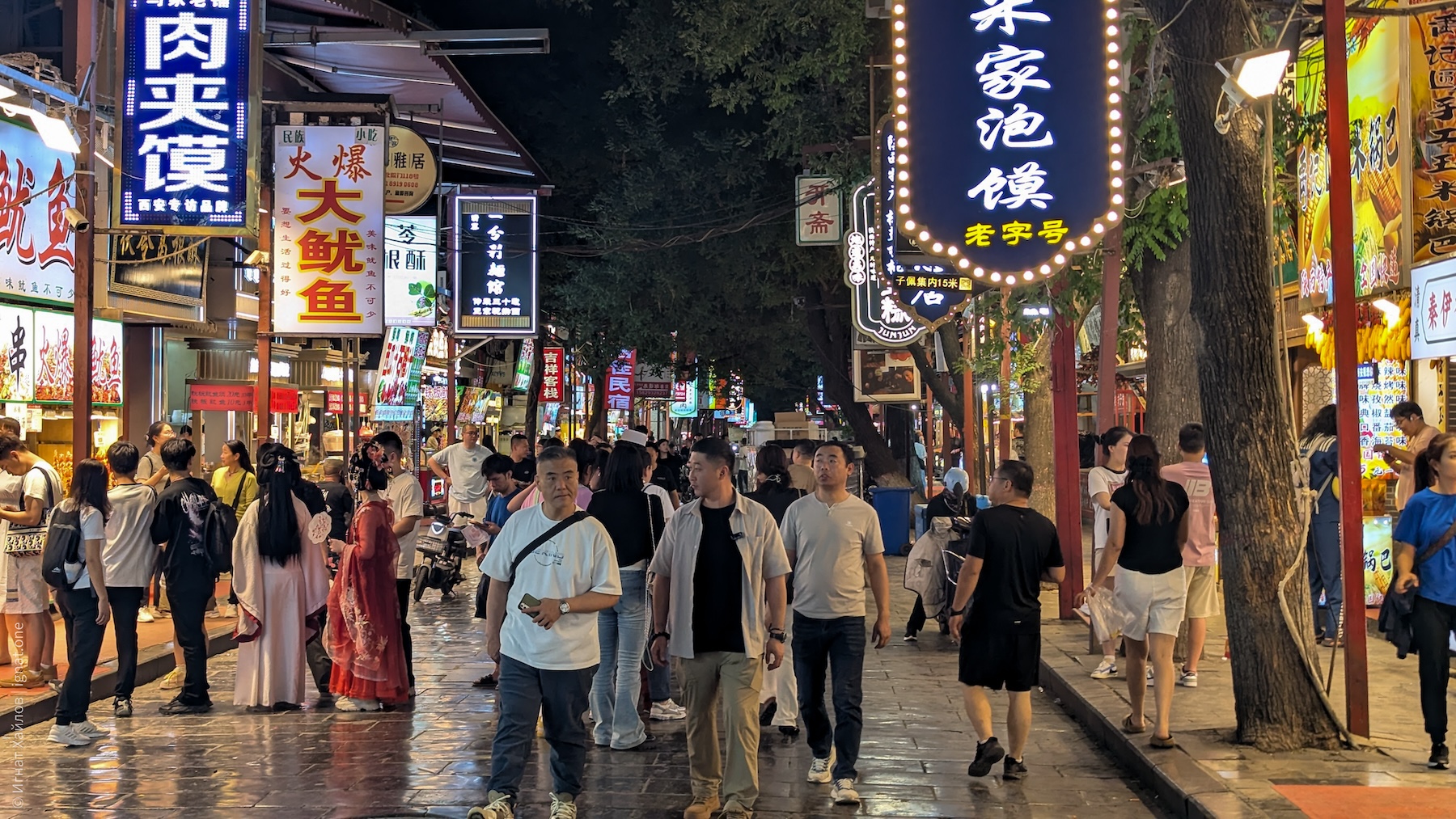 Сфотографировались, и пошли на другую сторону площади. Где-то в этот момент я стал получать удовольствие от Сианя и от Китая в целом. Если Пекин мне казался очень зарегулированным, то вот вечерний Сиань прямо раскрылся: мы оказались в каком-то калейдоскопе: китаянки в традиционных нарядах, уличные фотографы, стримеры, лавки с едой, просто толпы гуляк — все оказались в одном месте. Город просто задышал. После Пекина это был как глоток свежего воздуха.