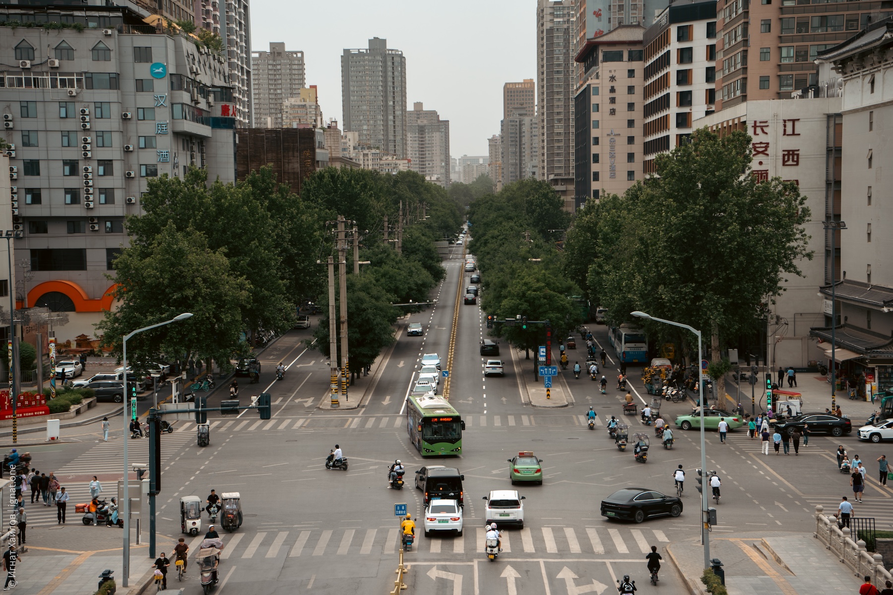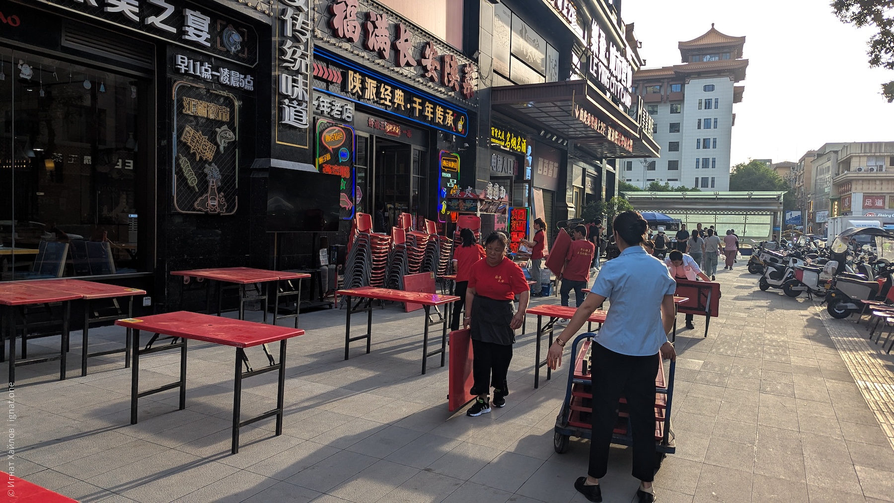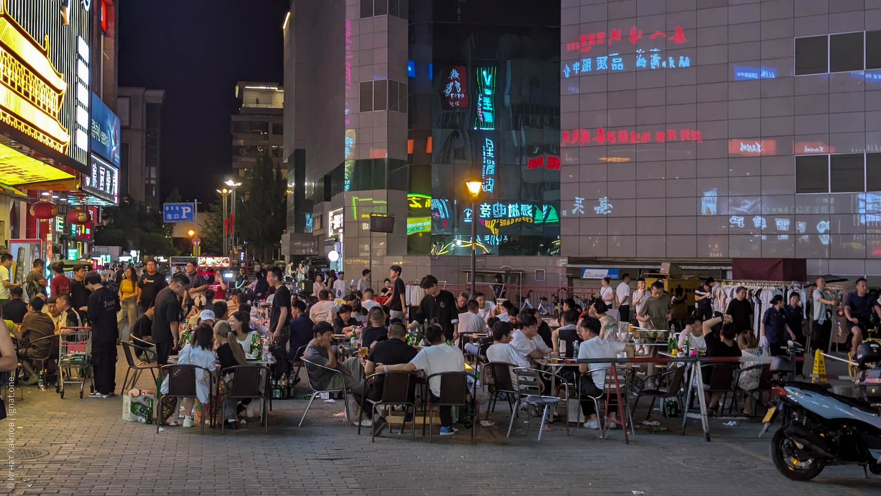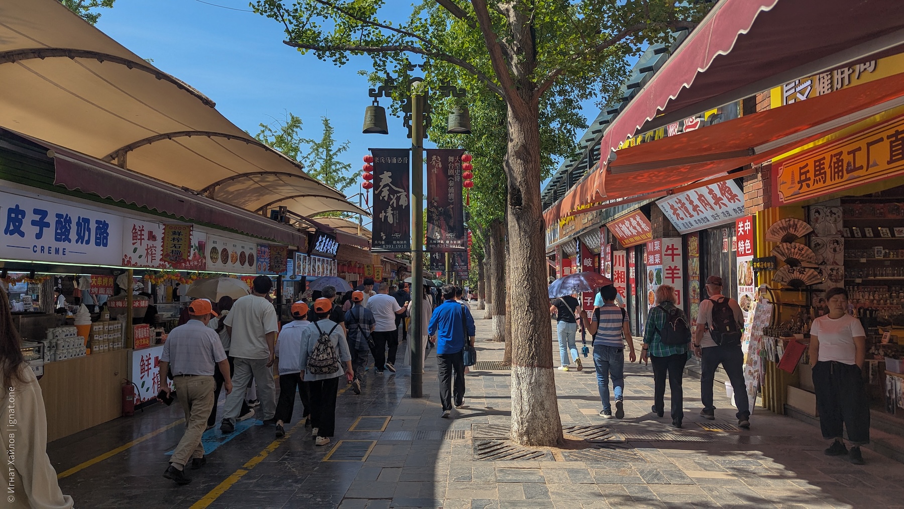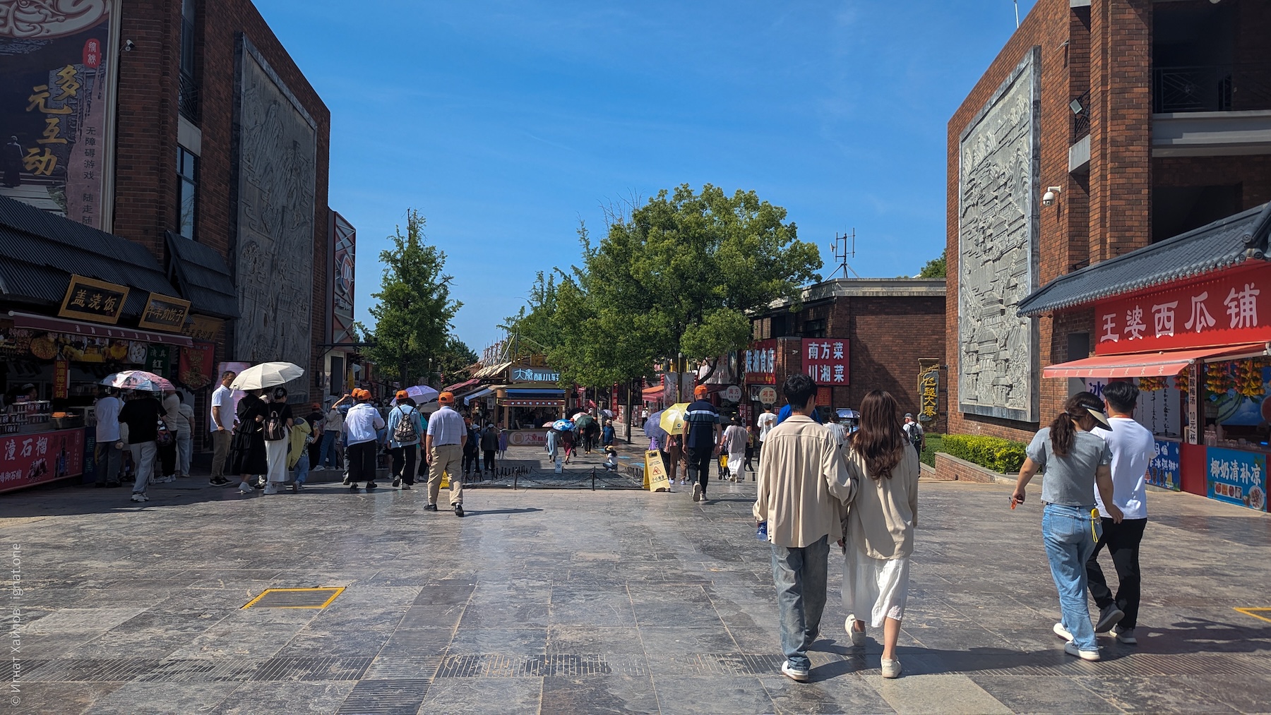 Сфотографировались, и пошли на другую сторону площади. Где-то в этот момент я стал получать удовольствие от Сианя и от Китая в целом. Если Пекин мне казался очень зарегулированным, то вот вечерний Сиань прямо раскрылся: мы оказались в каком-то калейдоскопе: китаянки в традиционных нарядах, уличные фотографы, стримеры, лавки с едой, просто толпы гуляк — все оказались в одном месте. Город просто задышал. После Пекина это был как глоток свежего воздуха.