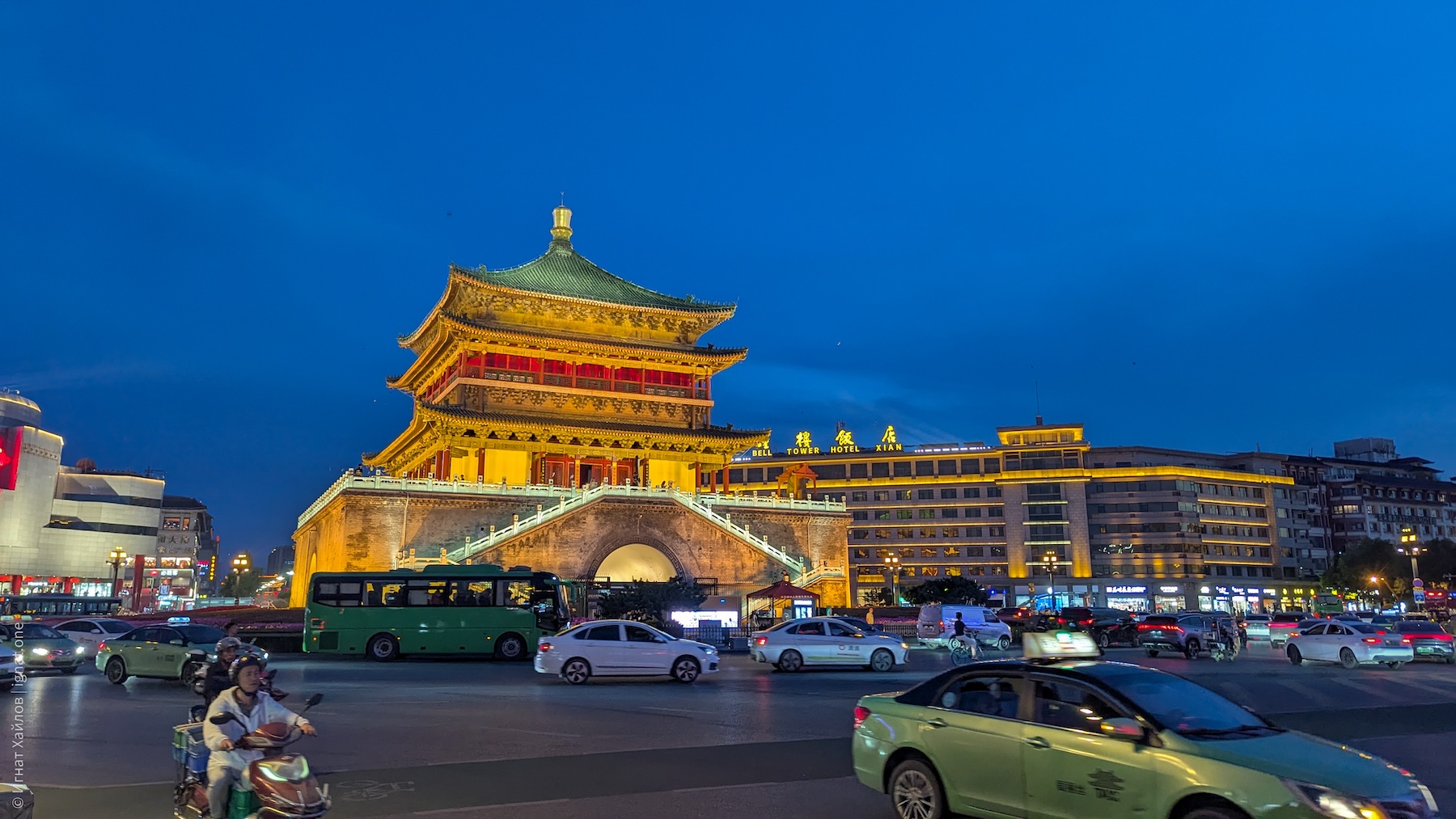 Чуть-чуть отойдя от гостиницы, увидели Колокольную башню (Bell Tower of Xi'an) — одну из главных достопримечательностей Сианя. Она расположена прямо в центре города на перекрестке четырех главных улиц, машины объезжают ее со всех сторон.