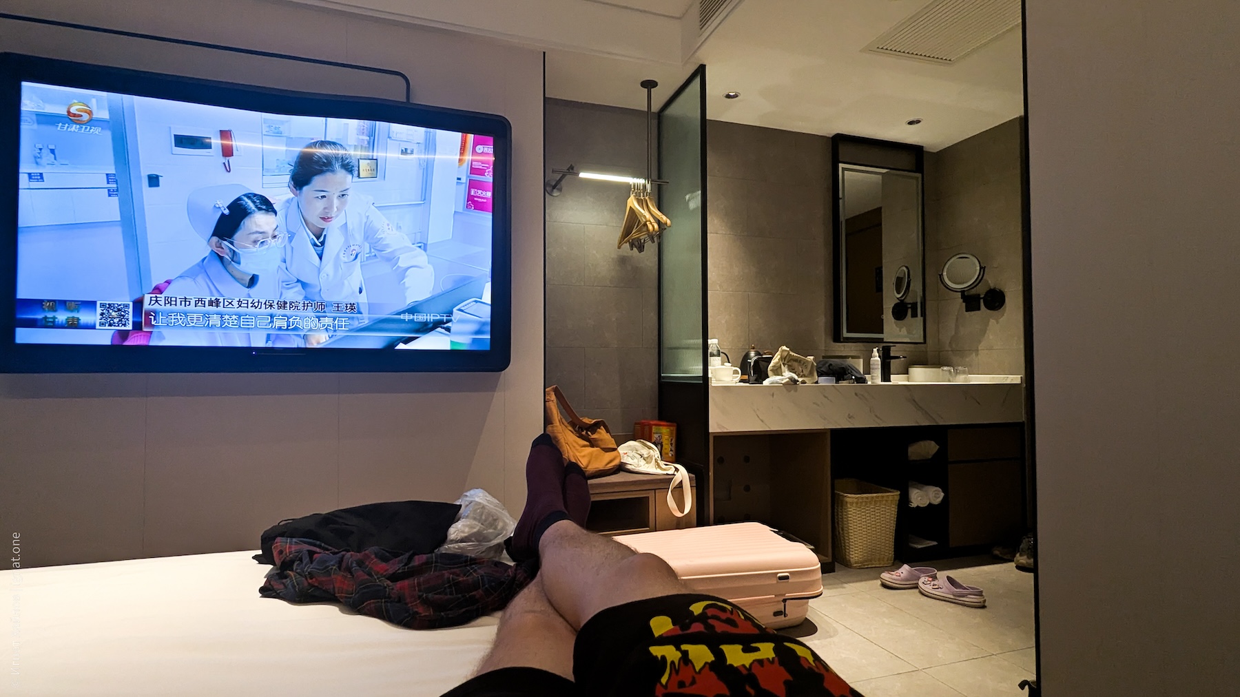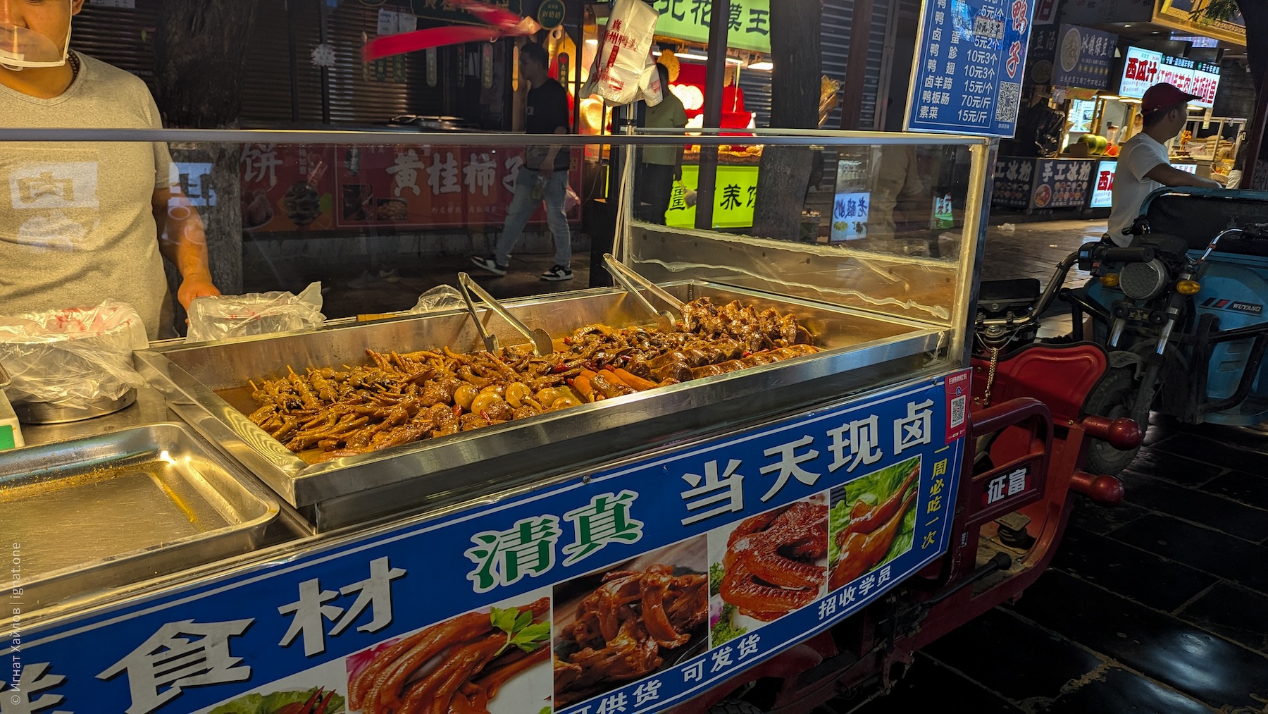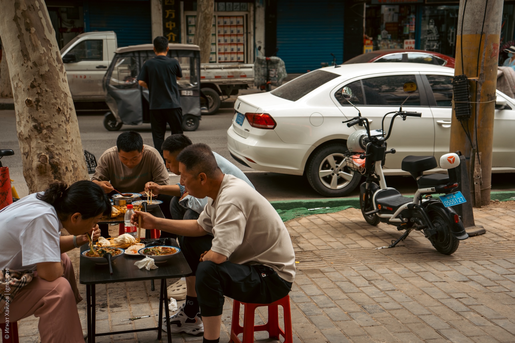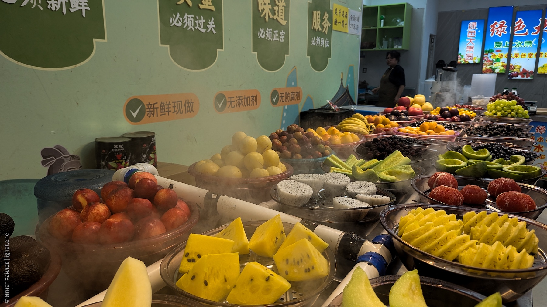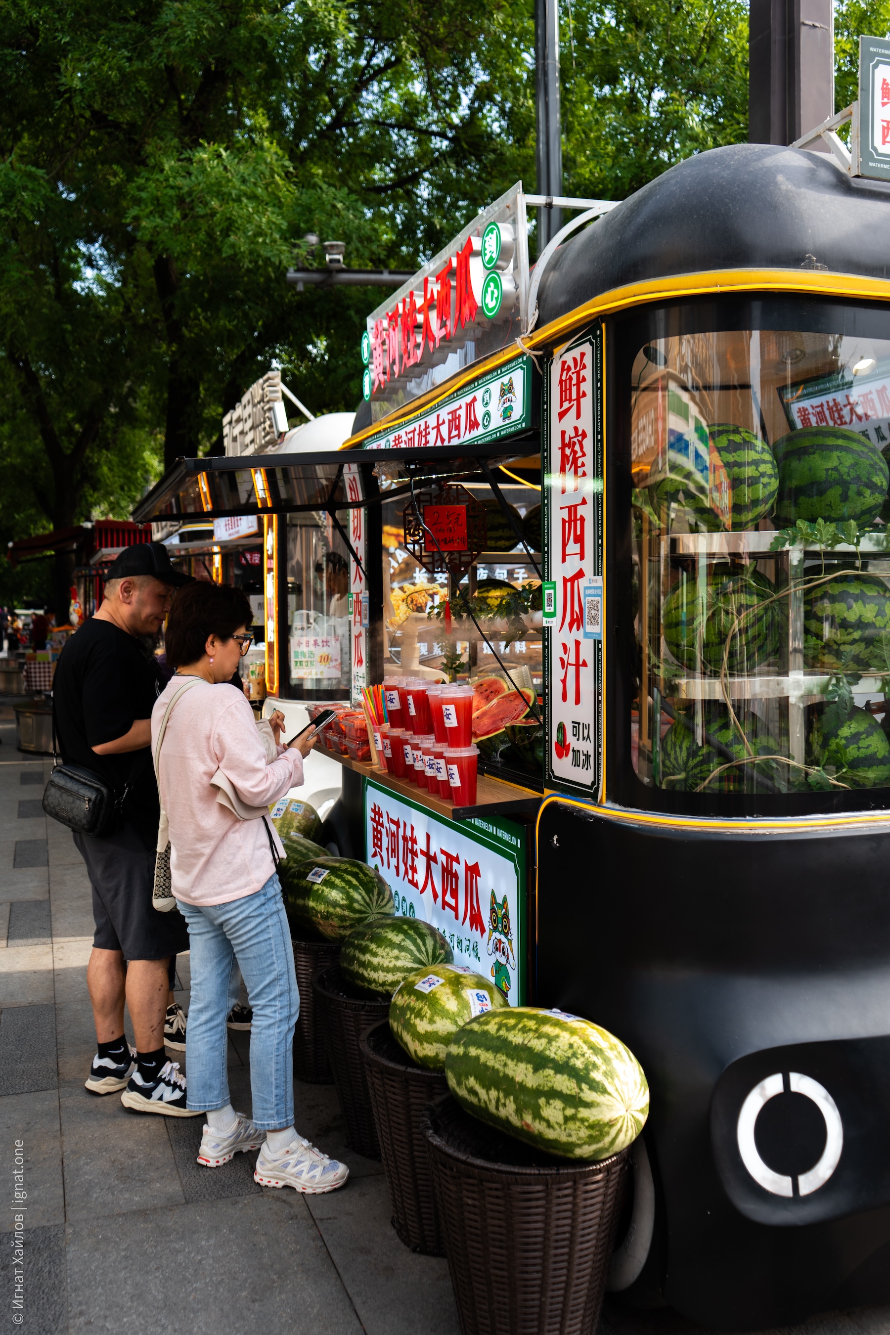 Заметили вот такую мобильную лавку с арбузами. К слову, почти во всех городах, где мы были, я регулярно натыкался на лавки с арбузными фрешами. Как потом прочитал — оказывается, Китай производит более 60% мирового урожая арбузов.