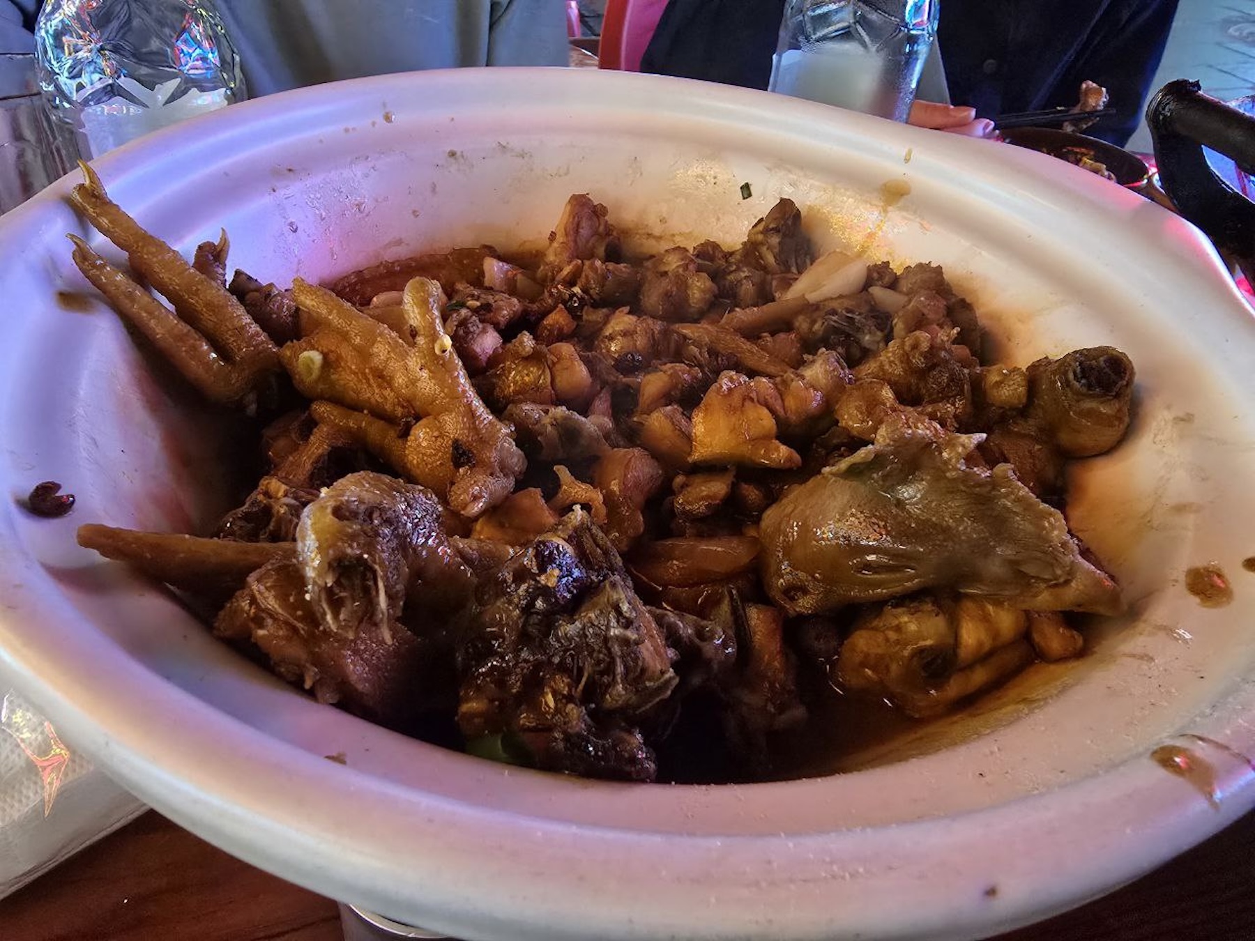 Вообще, по задумке, нам должны были принести тарелку с курицей и картошкой, и в целом так оно и было, но прикол был в том, что курицу порубили целиком, буквально, вместе с лапами, головой и всеми костями. Тонкие волокна мяса приходилось тщательно выуживать из тарелки.