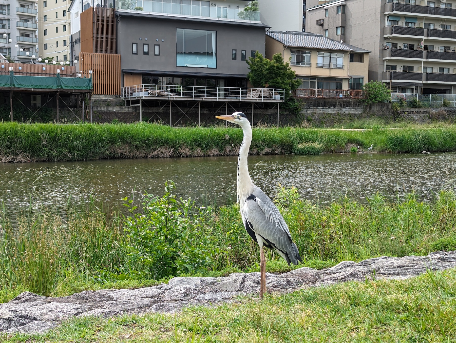 Скоро нужно будет ехать в Осаку, поэтому возвращаемся в гостиницу за вещами. Шли вдоль реки, встретили цаплю