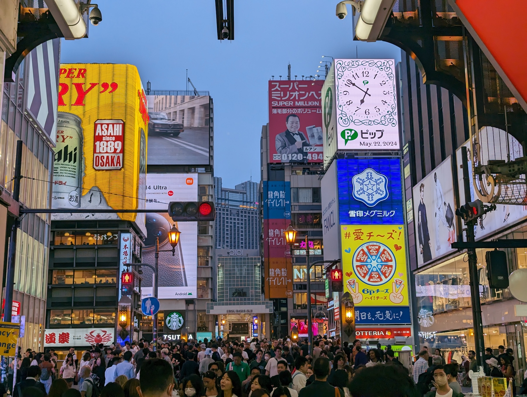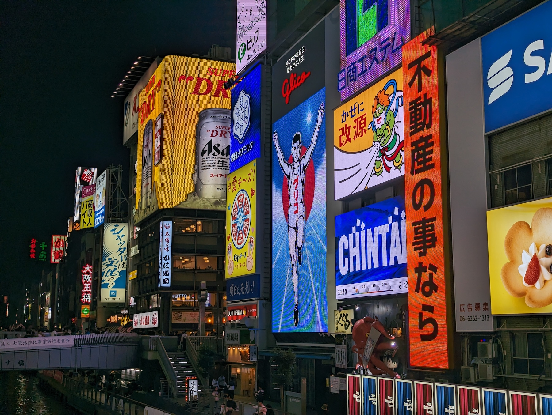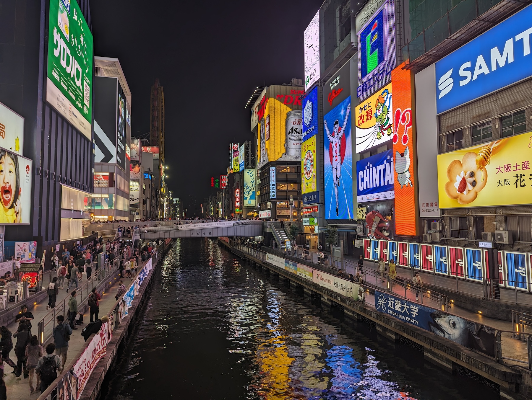 Выходим на набережную Дотонбори — канал в районе Нанива, вокруг которого расположен один из самых оживленных и колоритных кварталов Осаки. Набережная поражает с первого взгляда — яркие неоновые вывески, толпы людей, кафе с уличной едой — это оставило самые яркие впечатления за все дни поездки