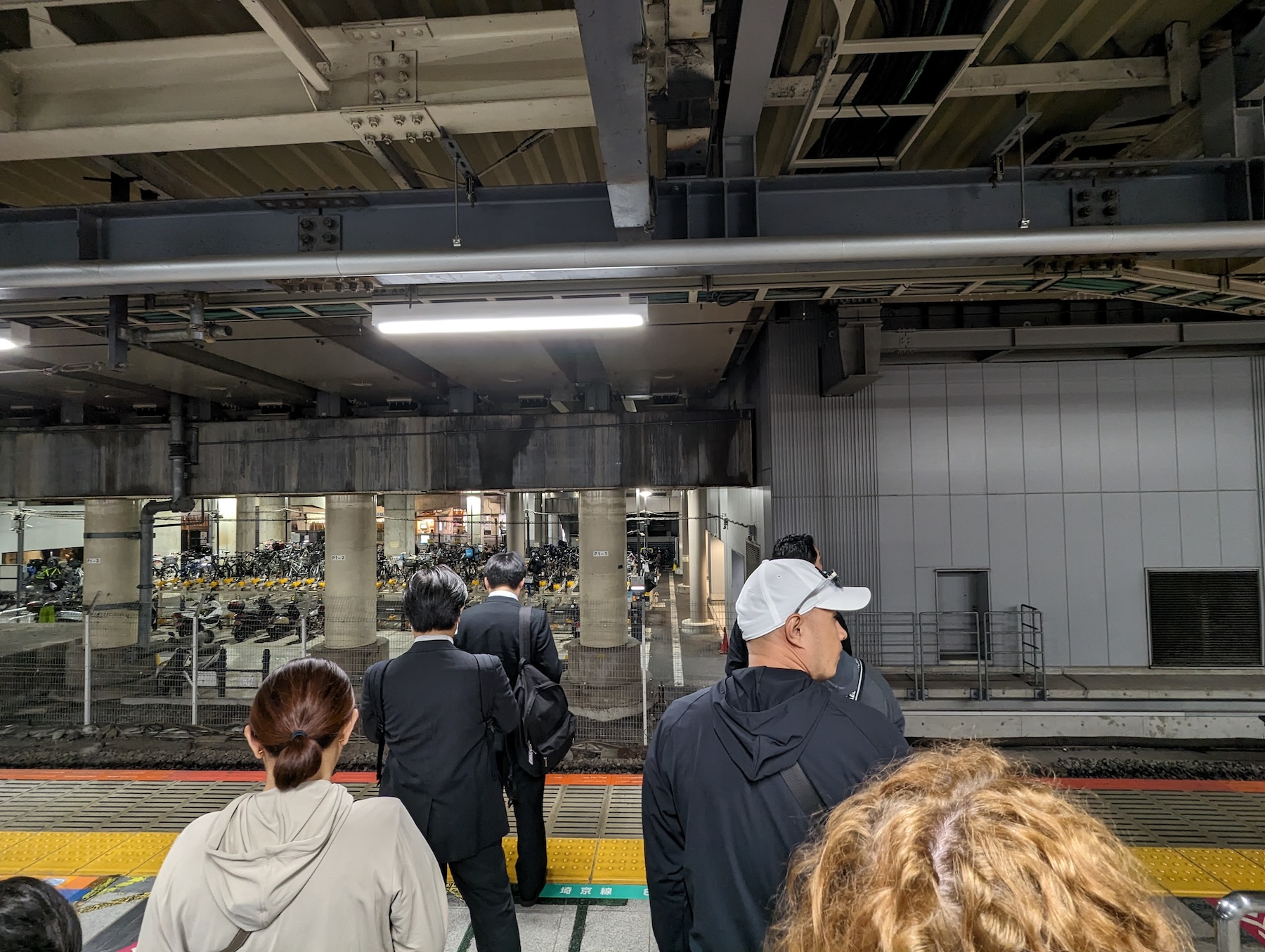 Японцы становятся в ровные очереди в ожидании поезда. Мы такое еще не раз встретим