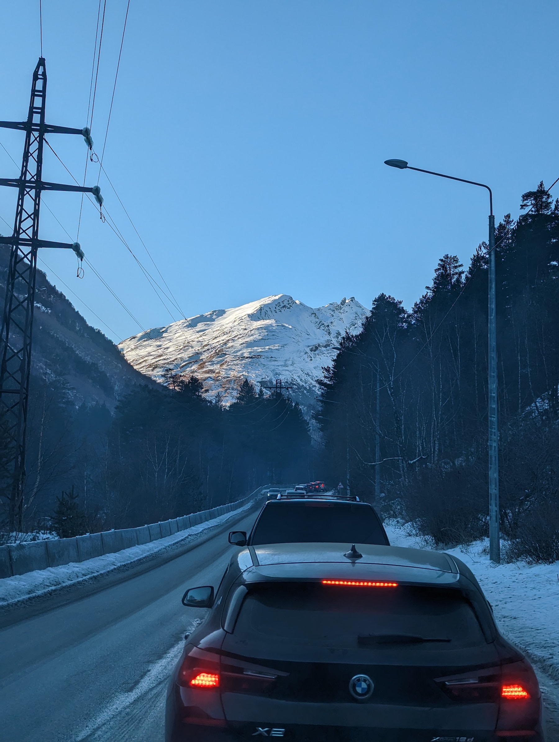 И где-то уже при подъезде к Поляне Азау, мы попадаем в часовую пробку. Сначала думали, что случилась какая-то страшная авария, но как потом выяснилось, просто ДПСники сильно ограничивали входящий поток машин.