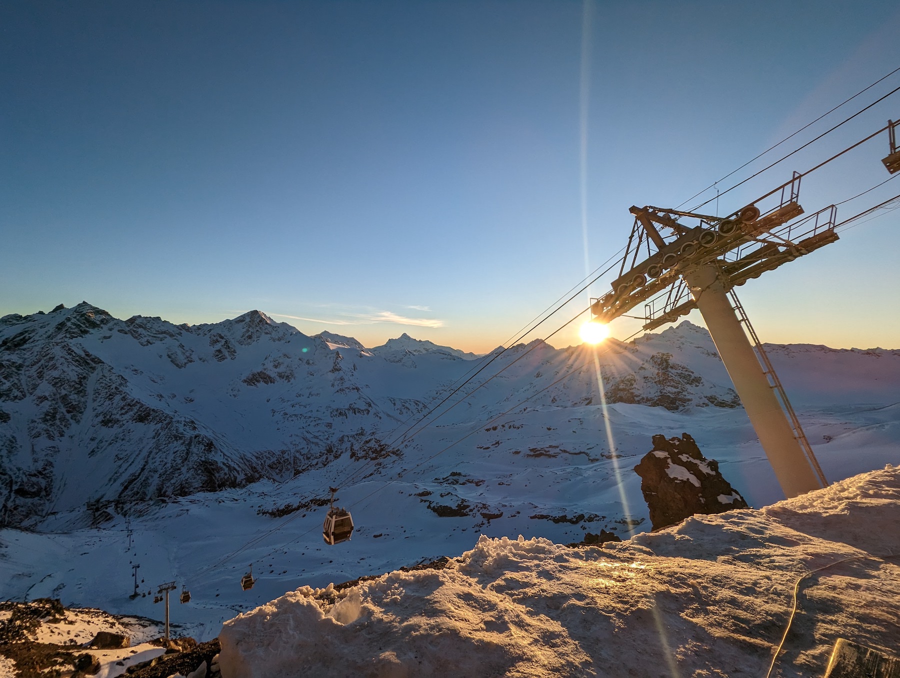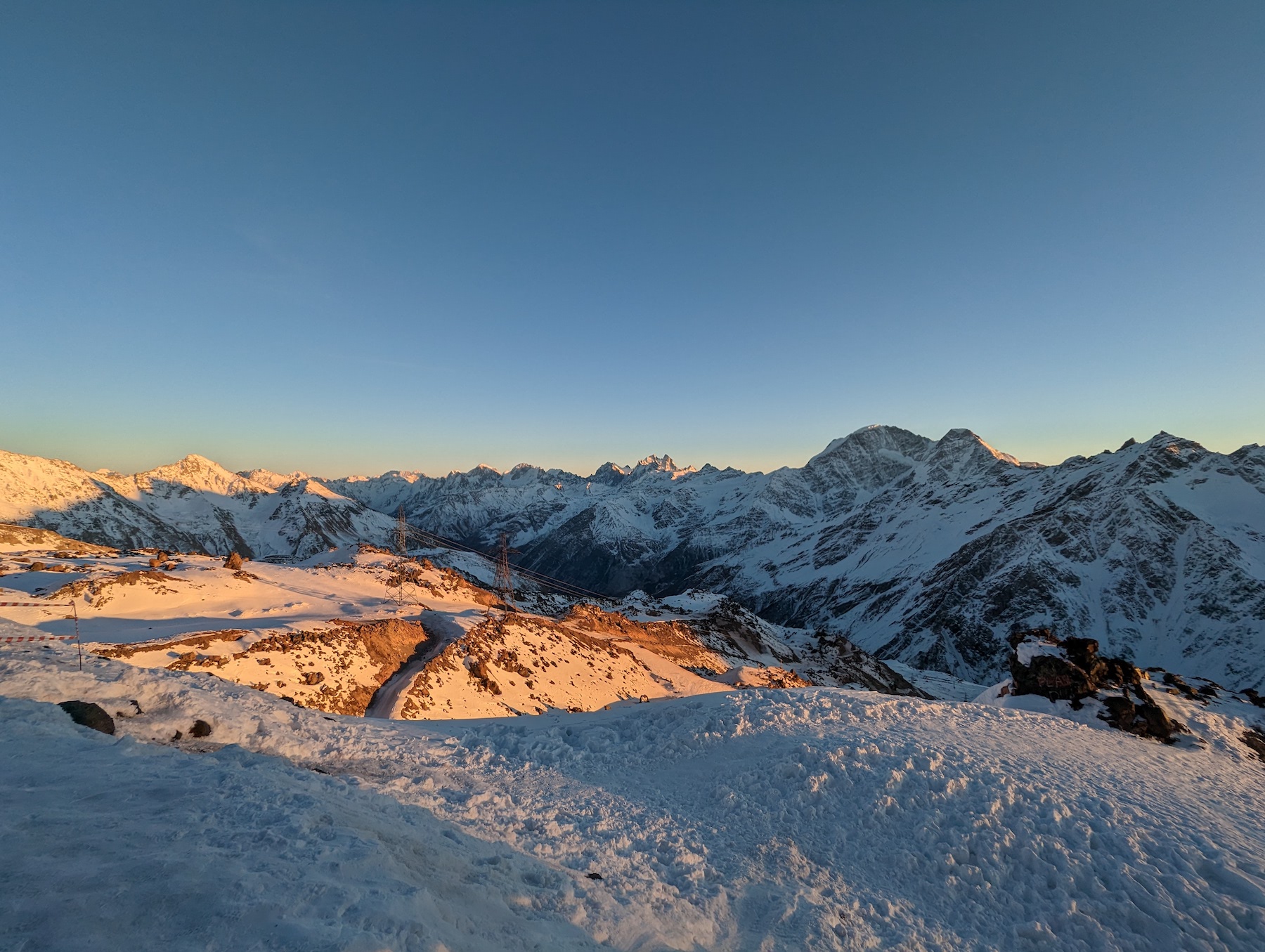 На самой Поляне Азау действовали две канатные дороги — новая и старая. На новой можно было подняться выше, но мы не успели, поехали на старой. Высота 3500м.