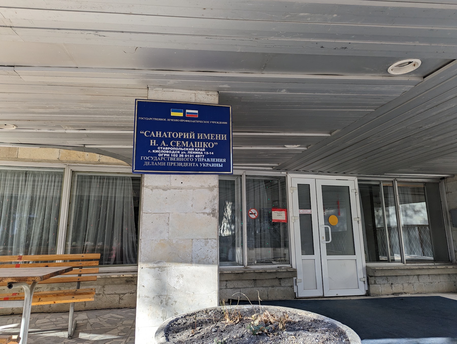 Честно говоря, в интернете преступно мало информации о самом санатории, а те источники, которые я находил, копируют друг друга. Но, насколько я понял, он до сих пор принадлежит Украине, о чем говорит табличка на входе: