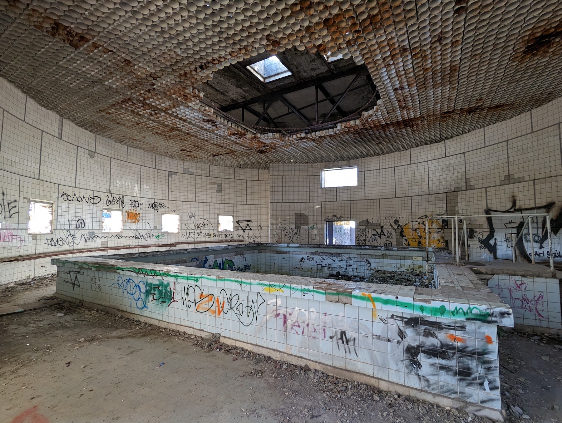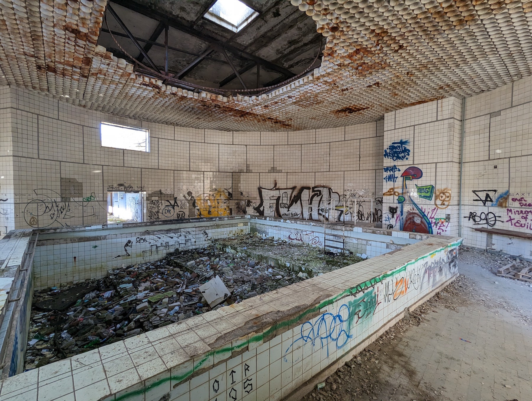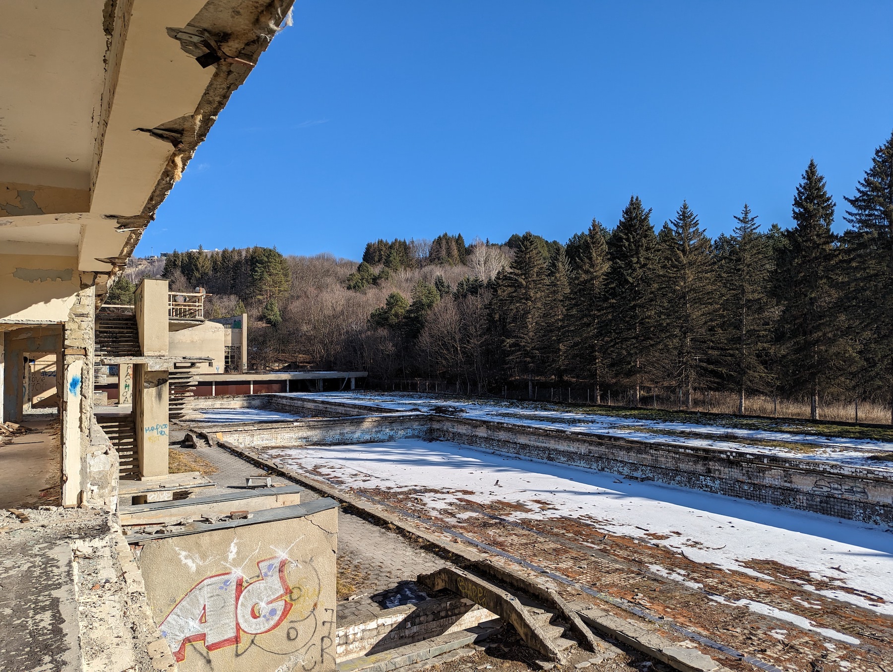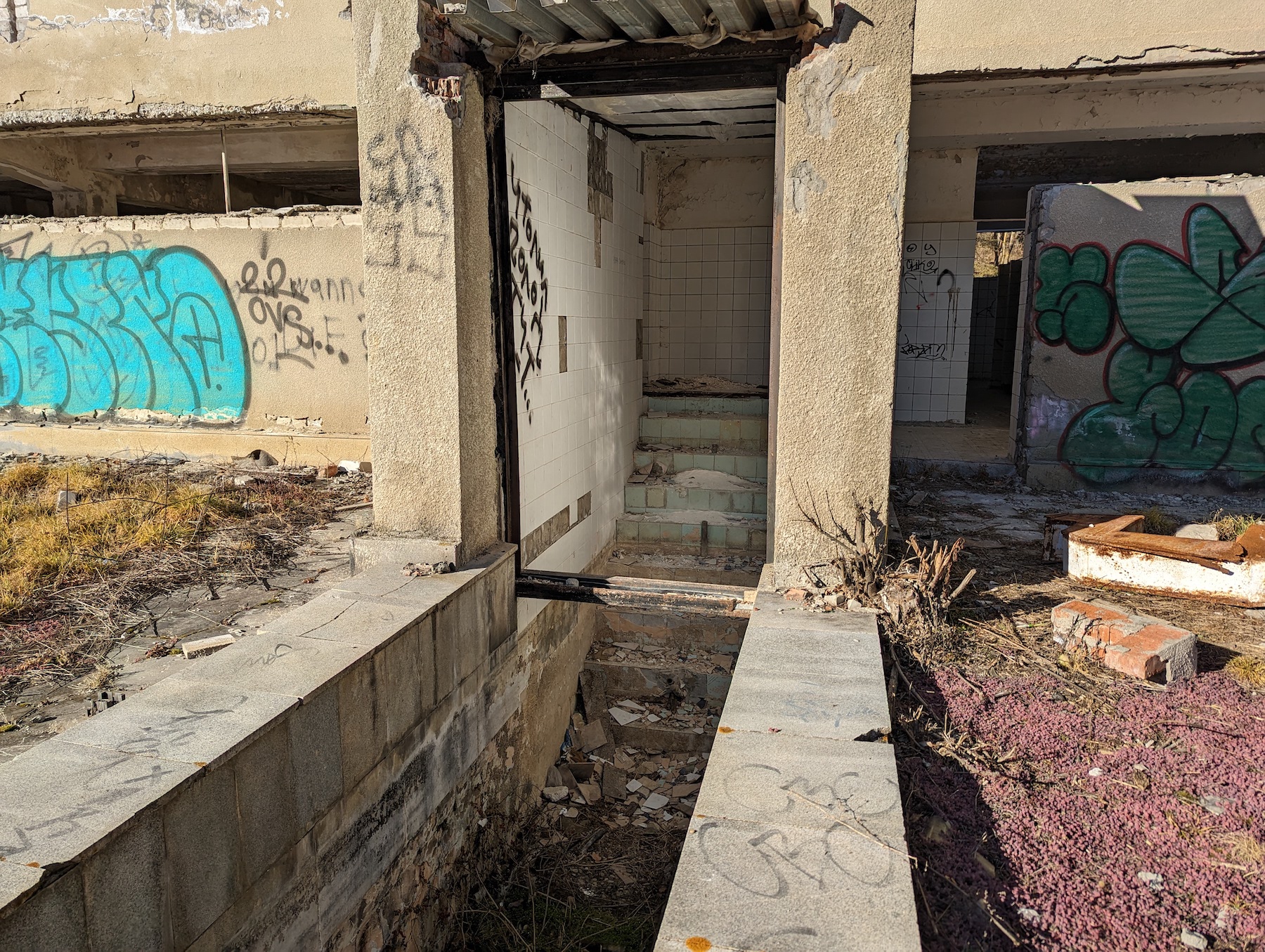 Проходим его насквозь и наконец приближаемся к финальной цели — заброшенного плавательного бассейна, асфальтированная дорожка к которому заканчивается, и при подходе начинается просто земля: