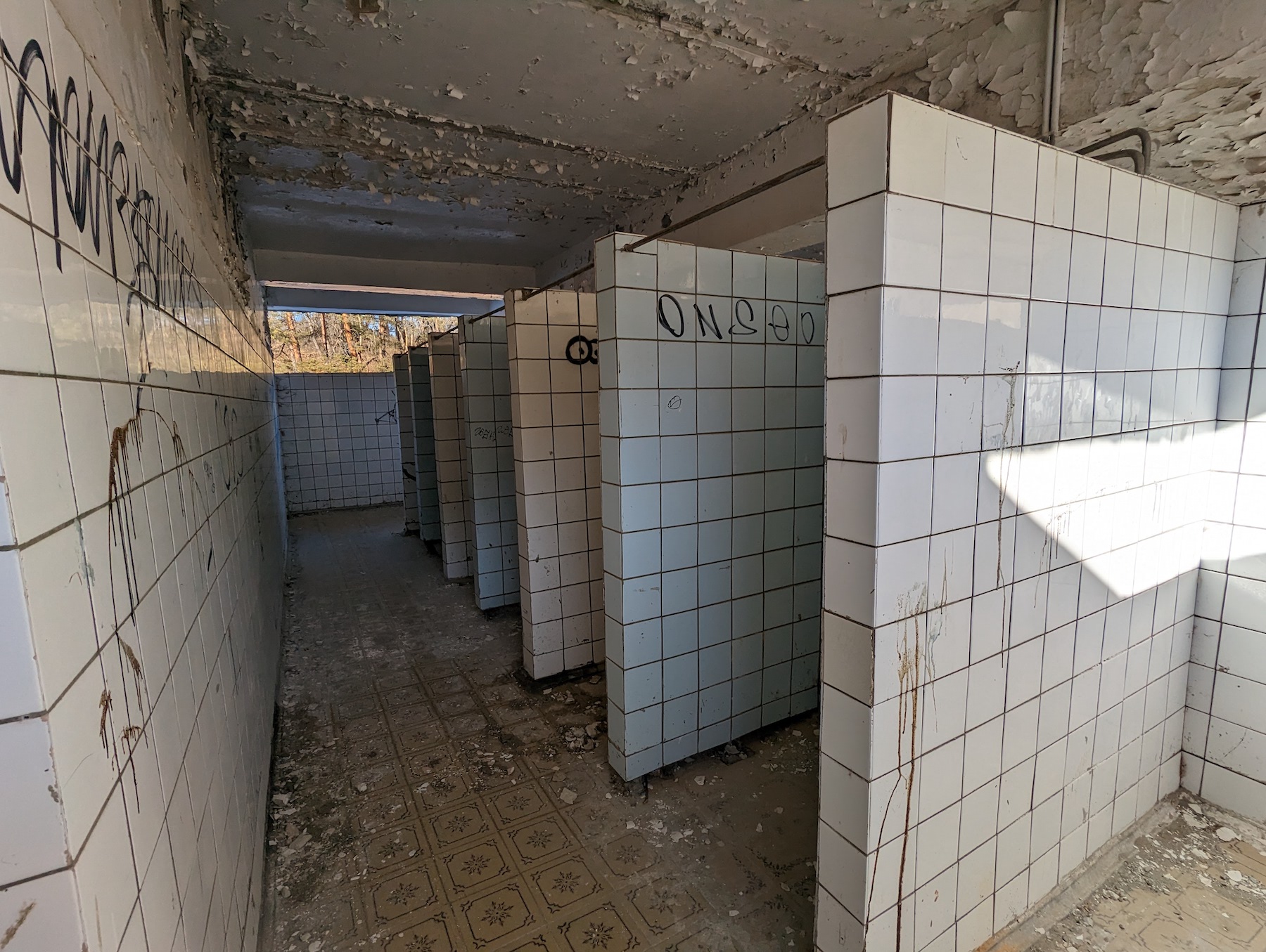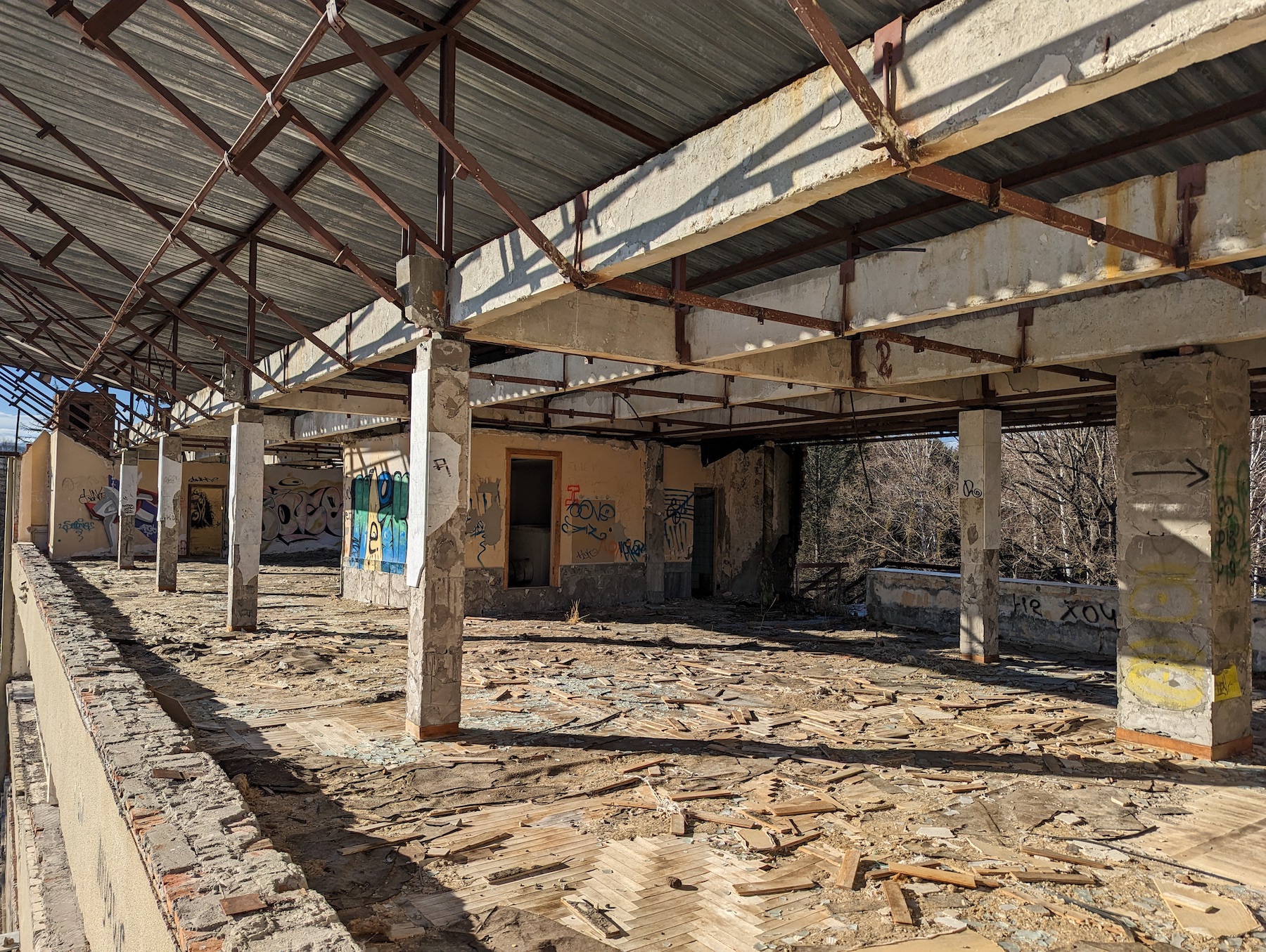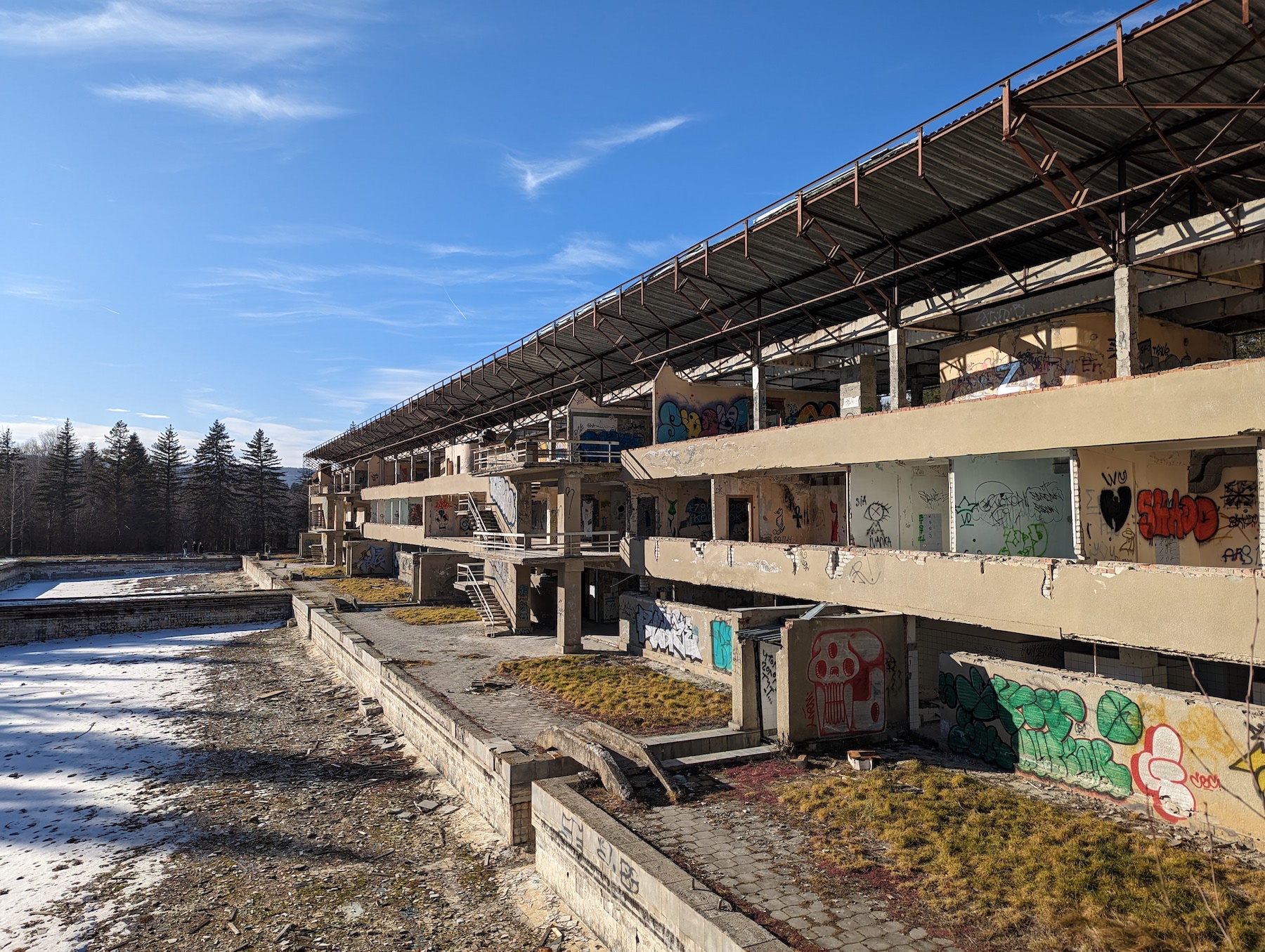 Проходим его насквозь и наконец приближаемся к финальной цели — заброшенного плавательного бассейна, асфальтированная дорожка к которому заканчивается, и при подходе начинается просто земля: