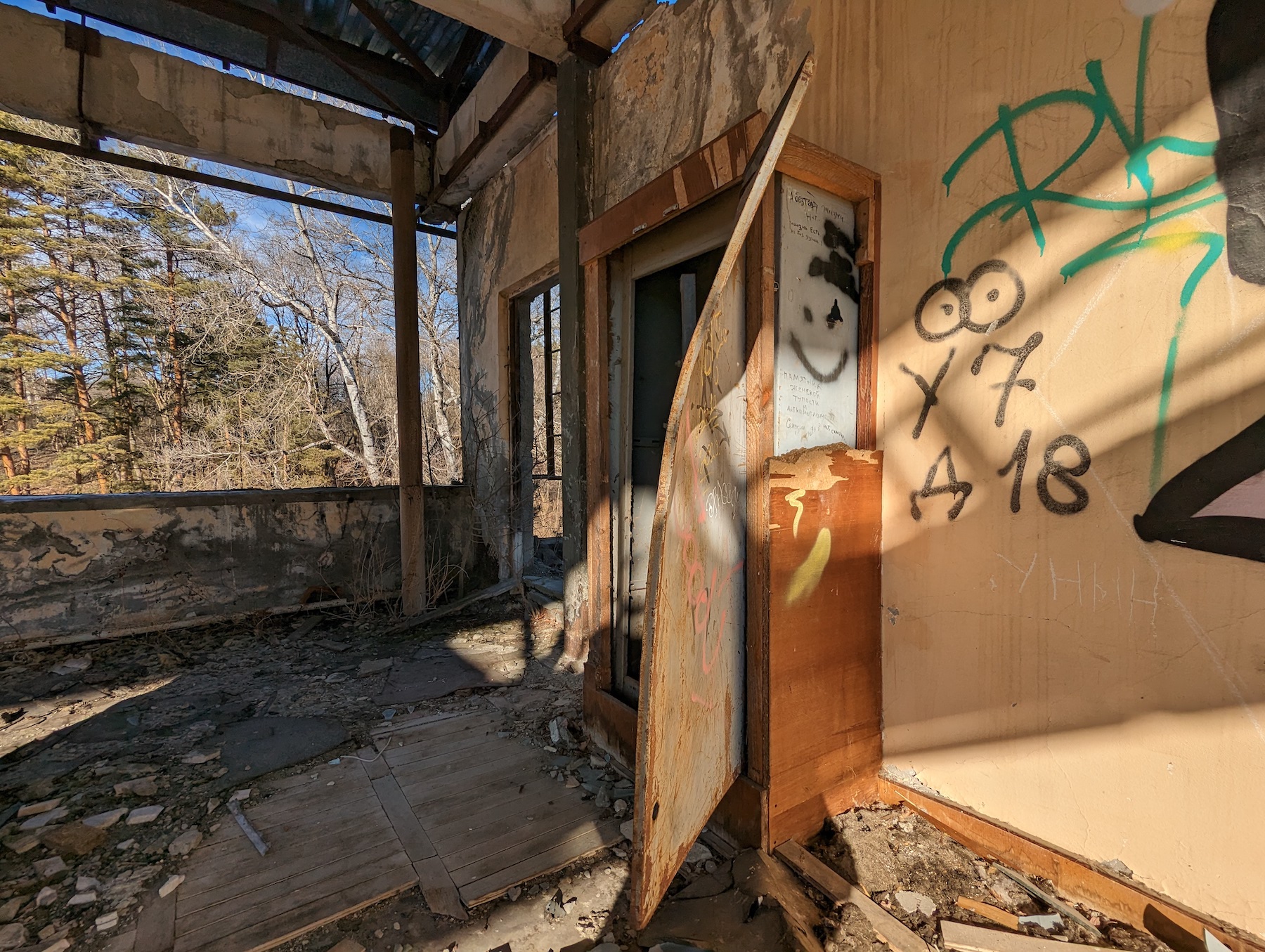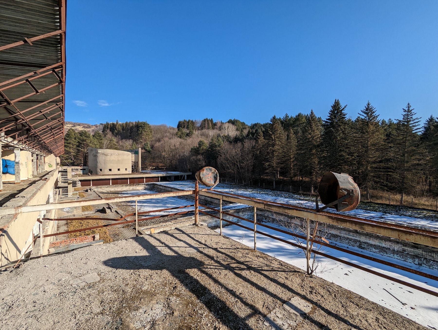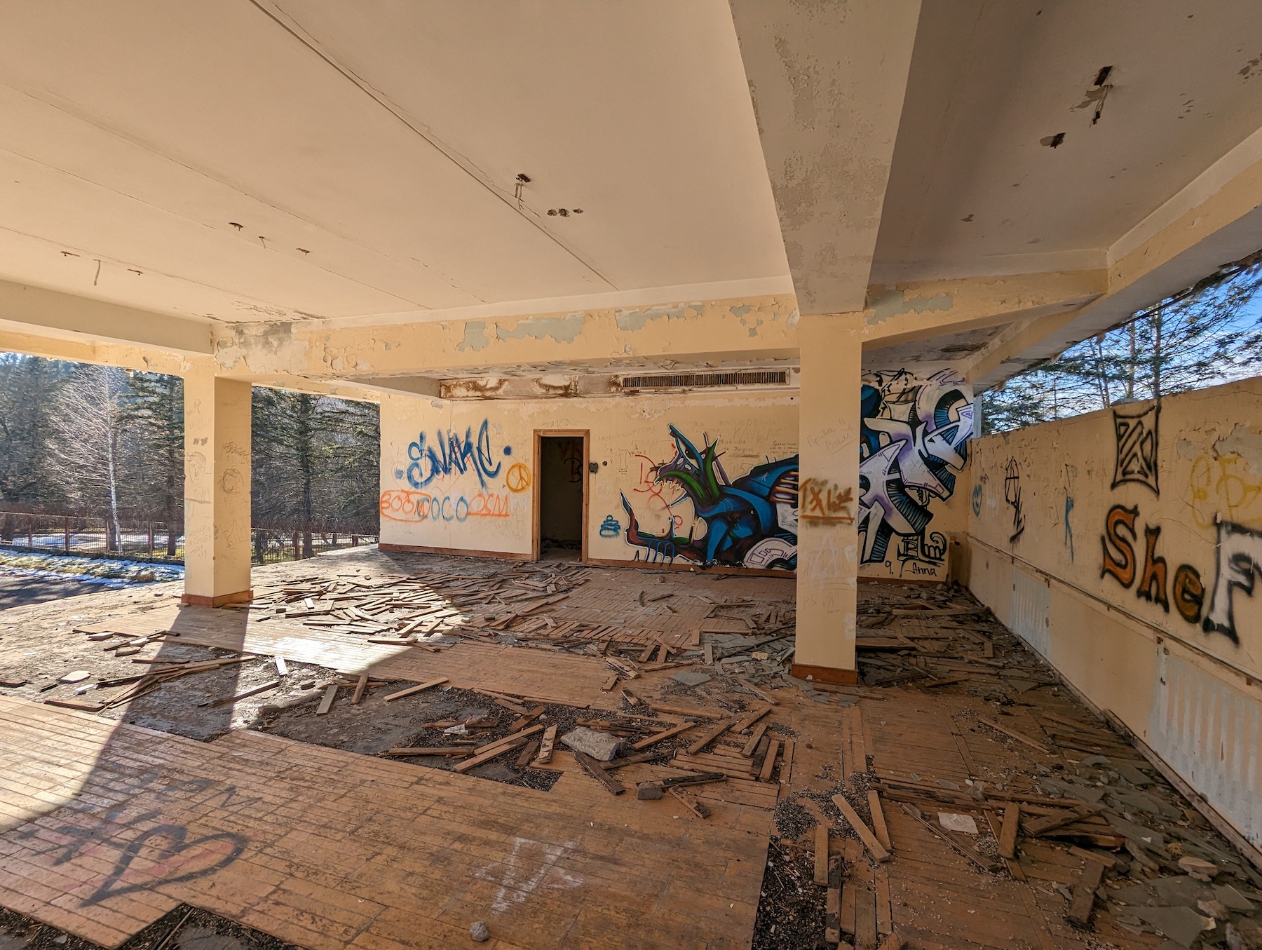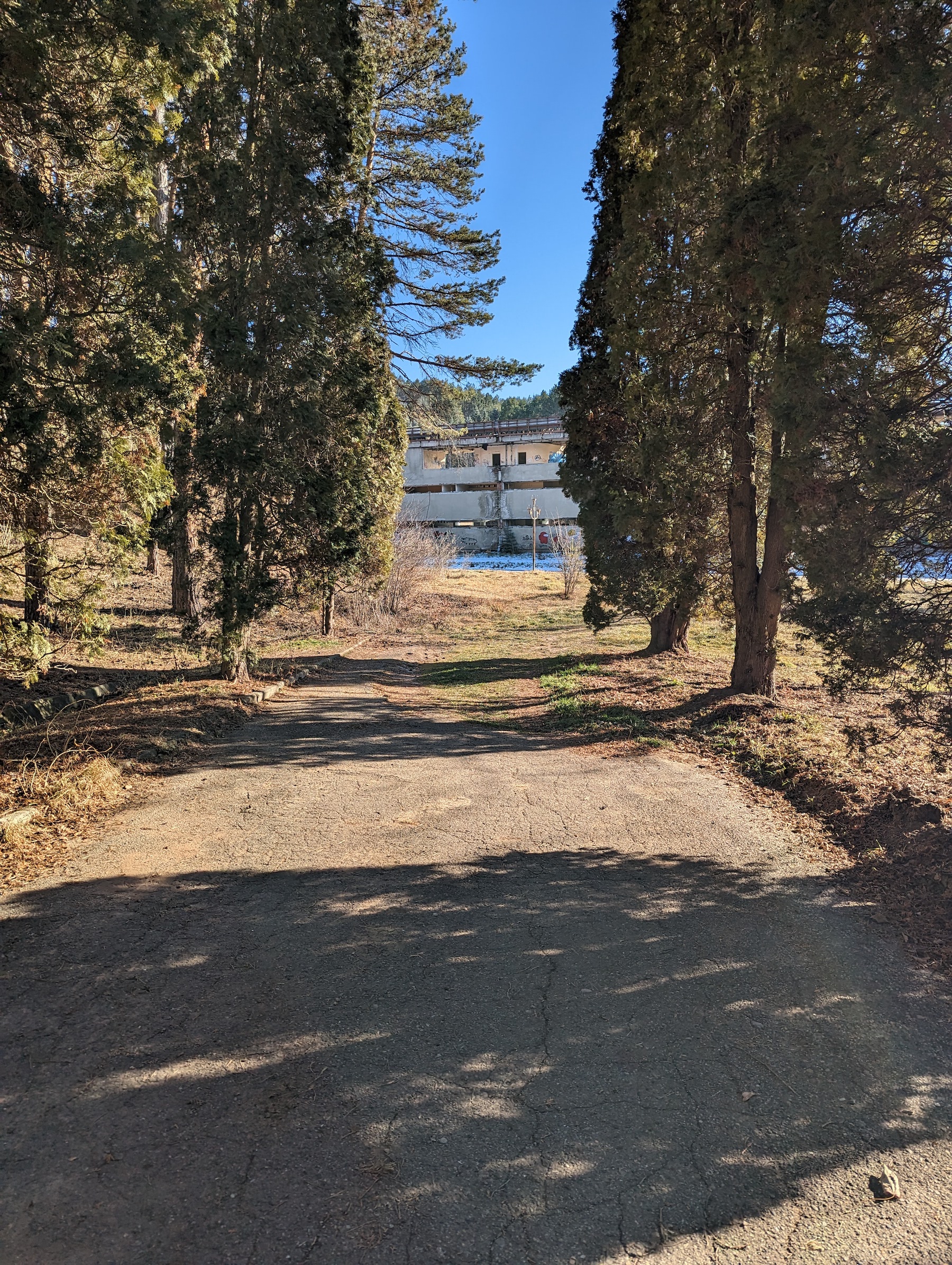 Проходим его насквозь и наконец приближаемся к финальной цели — заброшенного плавательного бассейна, асфальтированная дорожка к которому заканчивается, и при подходе начинается просто земля: